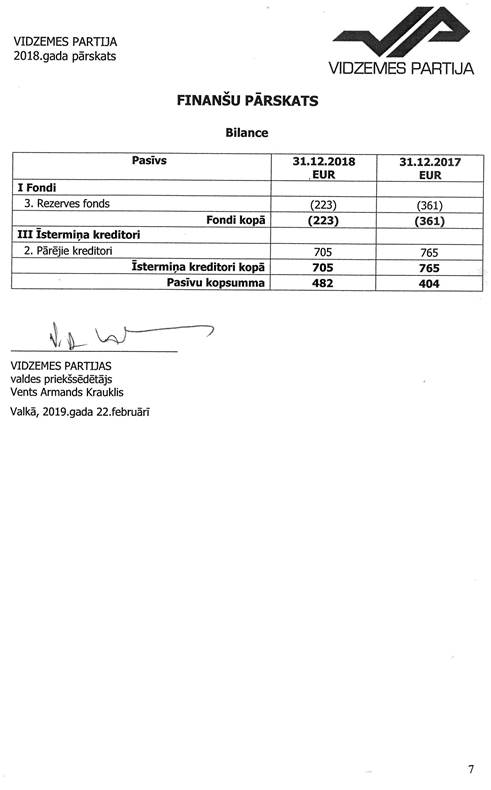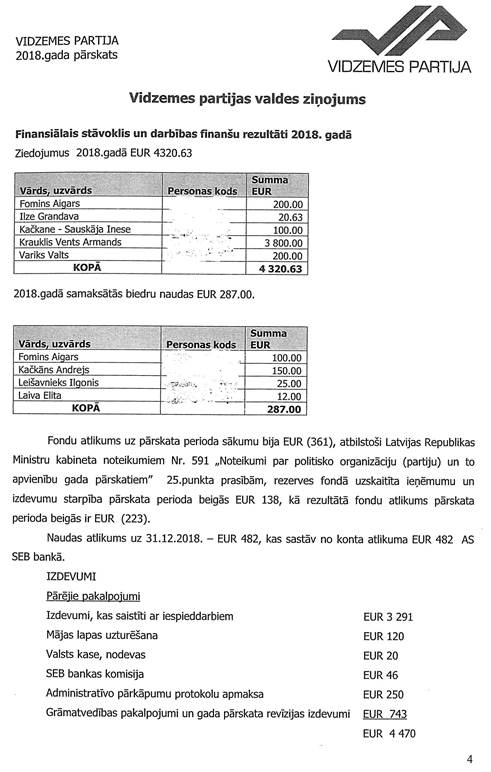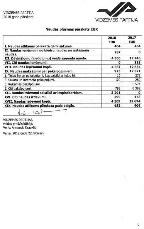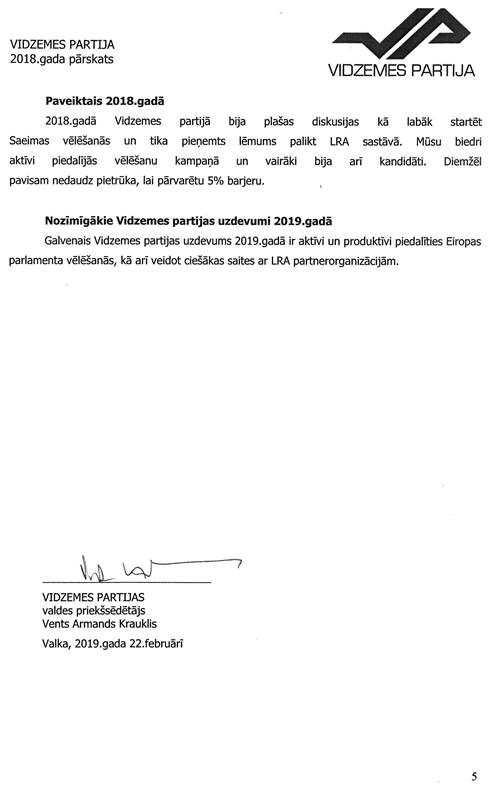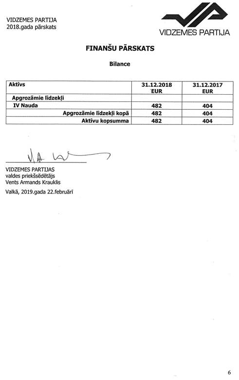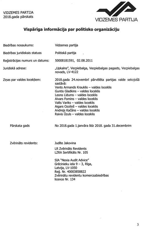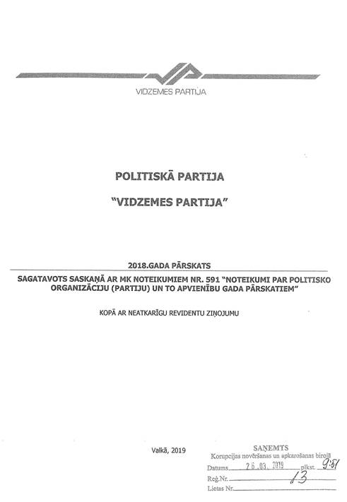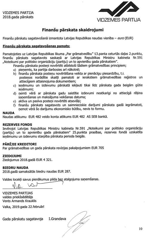 Politiskās partijas "VIDZEMES PARTIJA", reģ. Nr. 50008181591, gada pārskats par 2018.gadu
