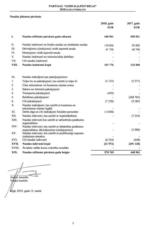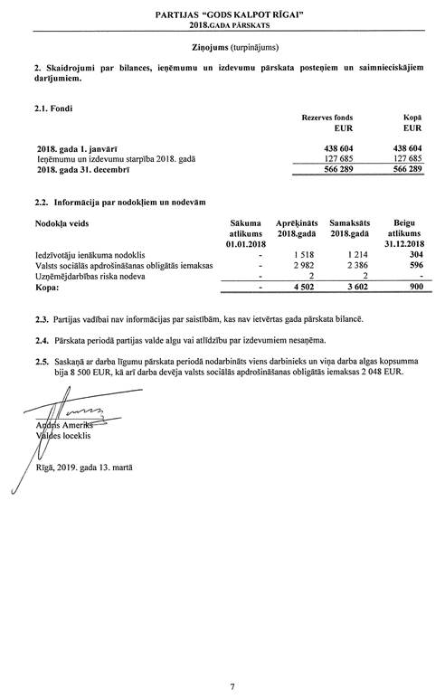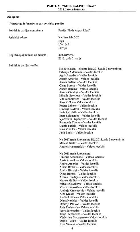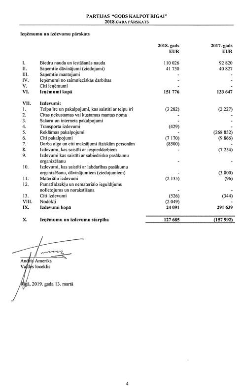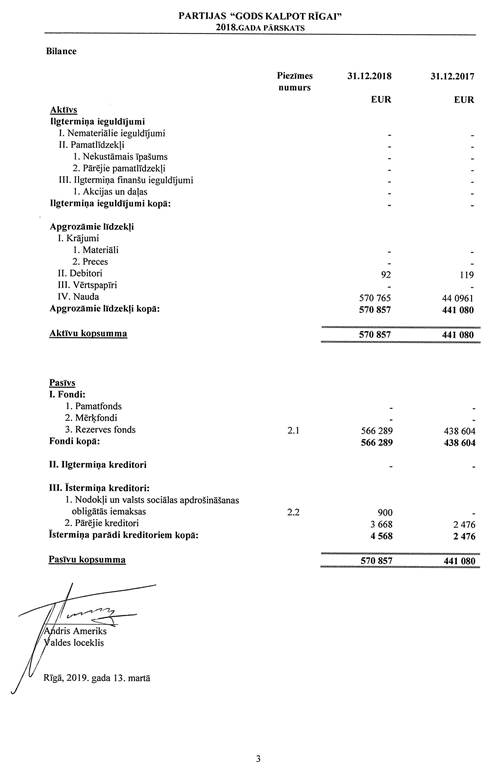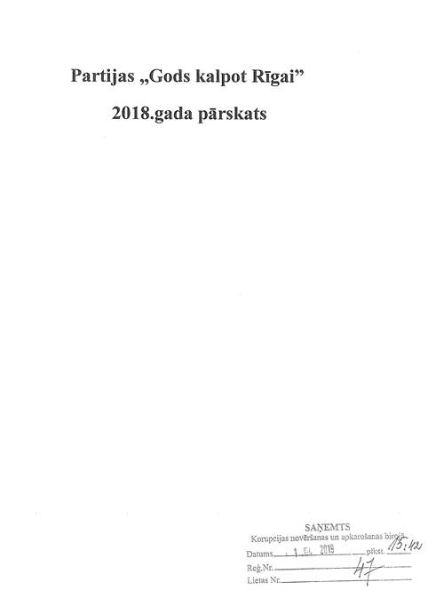Politiskās partijas "Partija "Gods kalpot Rīgai"", reģ. Nr. 40008193917, gada pārskats par 2018.gadu