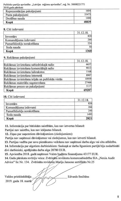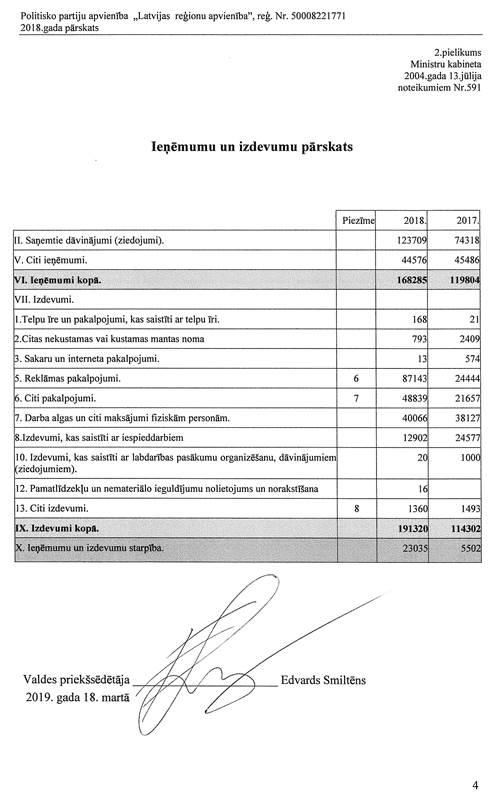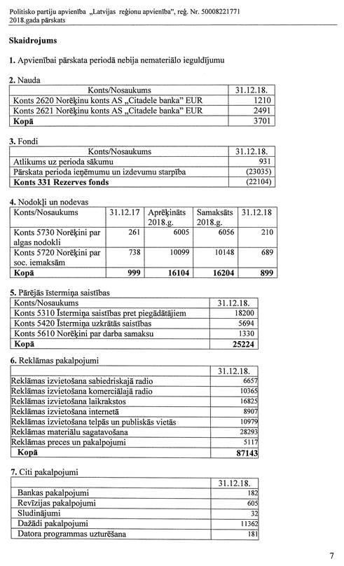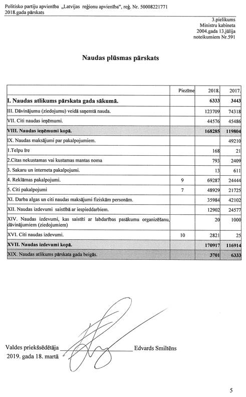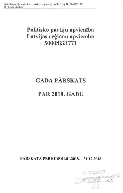 Politisko partiju apvienības "Latvijas reģionu apvienība", reģ. Nr. 50008221771, gada pārskats par 2018.gadu