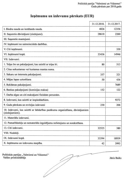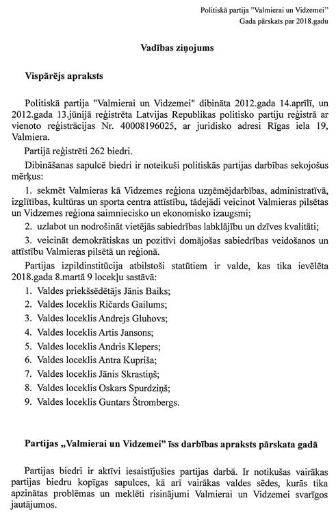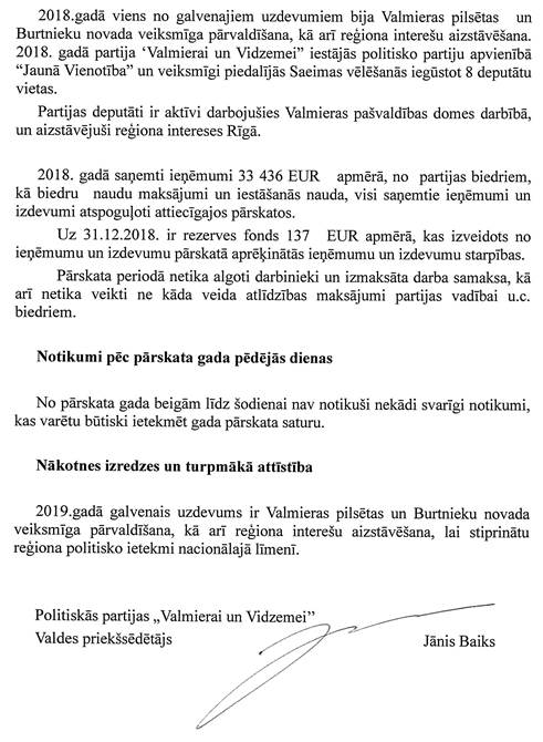Politiskās partijas "Valmierai un Vidzemei", reģ. Nr. 40008196025, gada pārskats par 2018.gadu