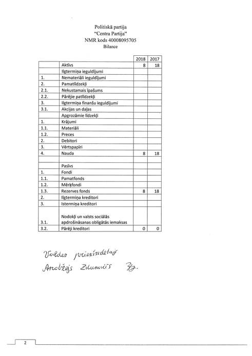 Politiskās partijas "Centra Partija", reģ. Nr. 40008095705, precizēts gada pārskats par 2018.gadu
