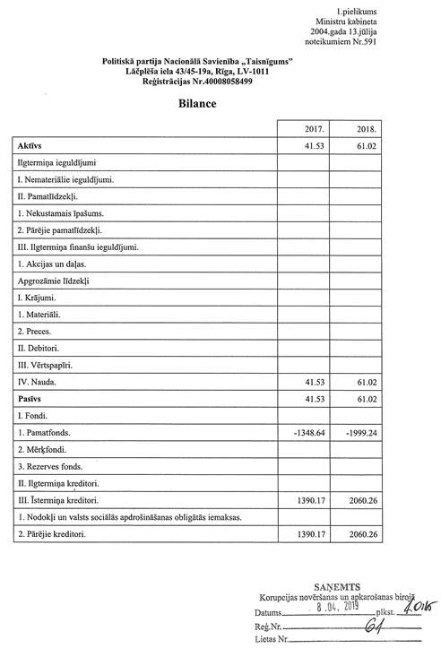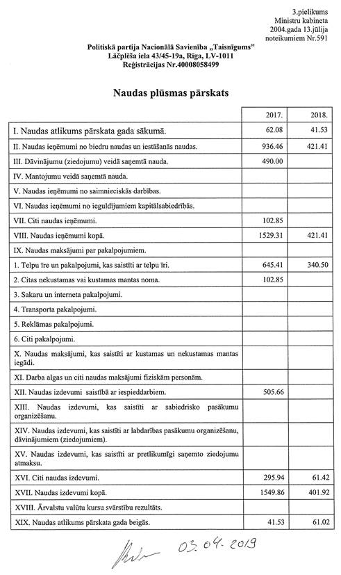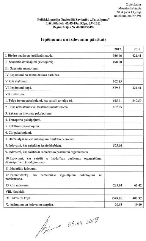 Politiskās partijas "Nacionālā Savienība TAISNĪGUMS", reģ. Nr. 40008058499, gada pārskats par 2018.gadu