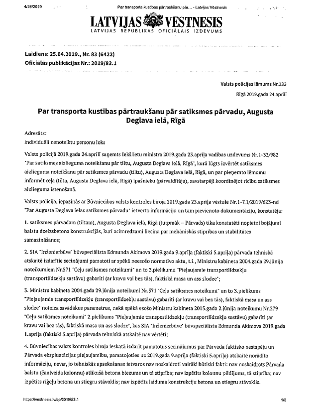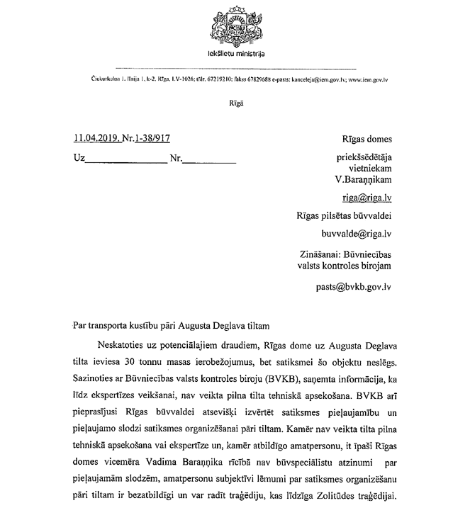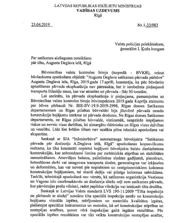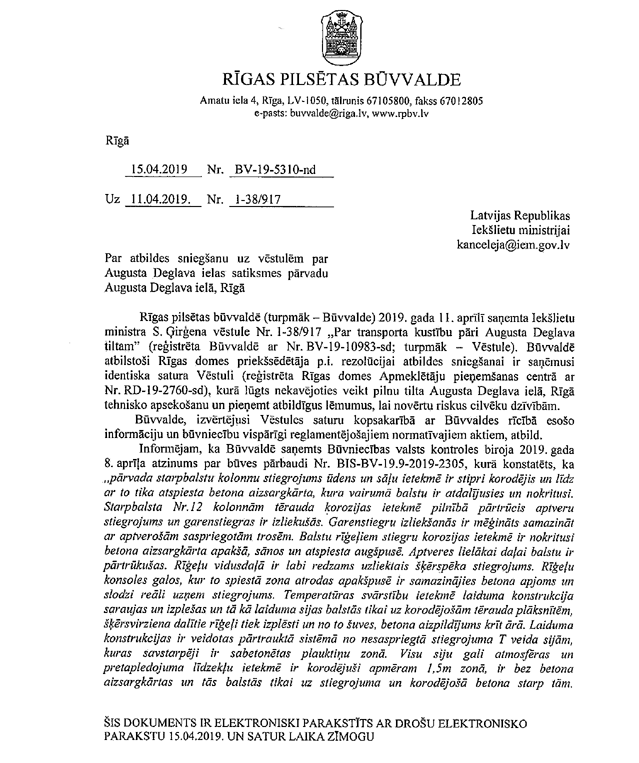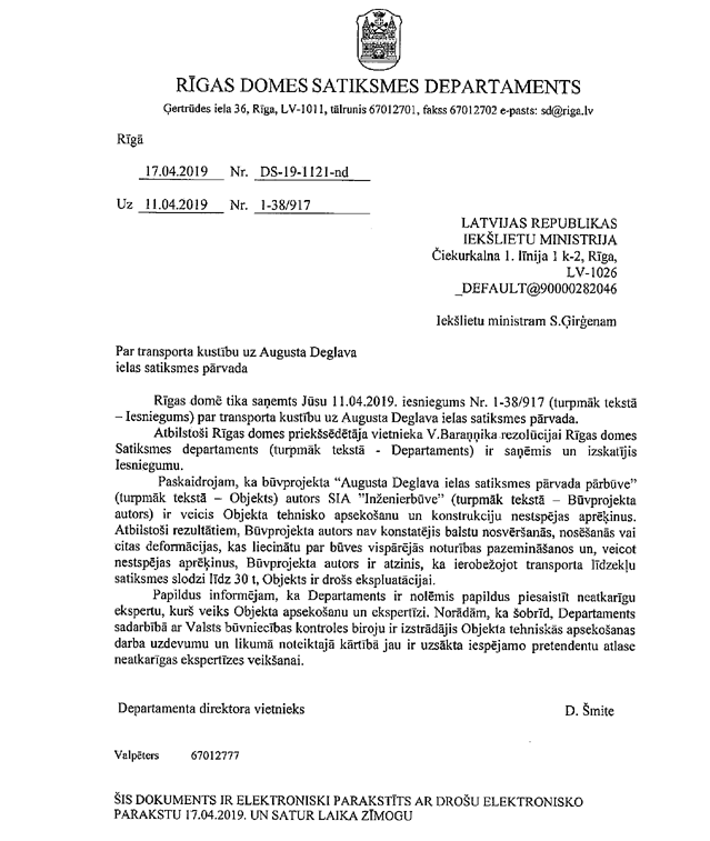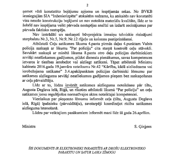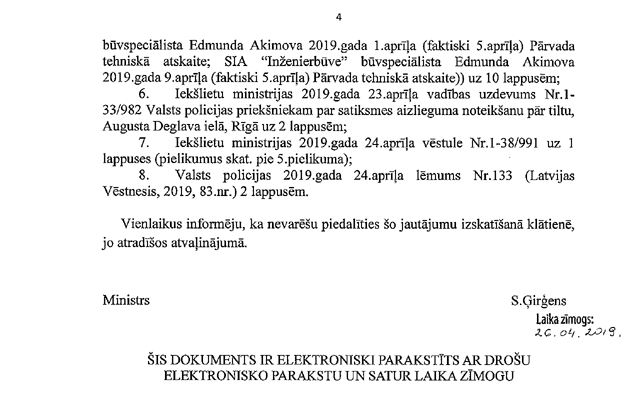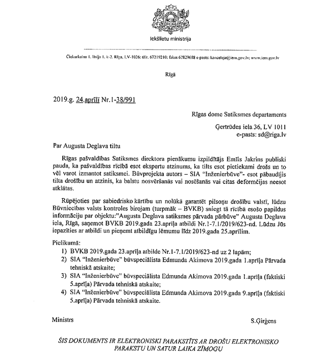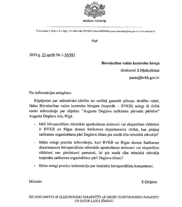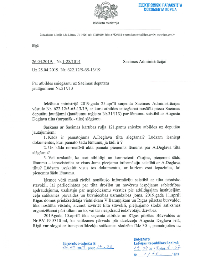 Par deputātu Zariņa, Ločmeles-Luņovas, Kabanova, Kucina un Cileviča jautājumu iekšlietu ministram Sandim Ģirģenam "Par lēmumu saistībā ar A. Deglava tilta slēgšanu". Saņemtā rakstveida atbilde iesniedzējus apmierina. Līdz ar to šodien paredzētā atbilžu sniegšana uz deputātu jautājumiem nenotiks. (Starpsaucieni: "Ooo!")