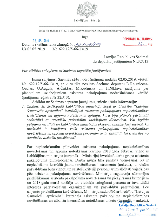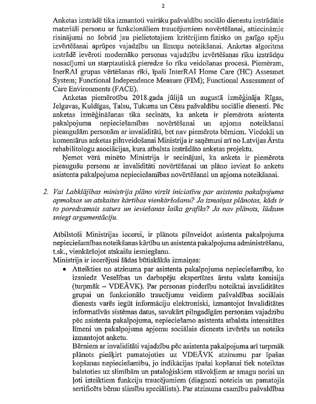 Par deputātu Reiznieces-Ozolas, Auguļa, Čakšas, Kučinska un Dūklava jautājumu labklājības ministrei "Par uzlabojumiem asistentu pakalpojuma apmaksas un atskaišu kārtībā". Saņemtā rakstveida atbilde iesniedzējus neapmierina. Ministre informē, ka nevarēs ierasties uz mutvārdu atbildes sniegšanu pulksten 17.00. Līdz ar to paredzētā atbilžu sniegšana uz deputātu jautājumiem šodien izpaliek.