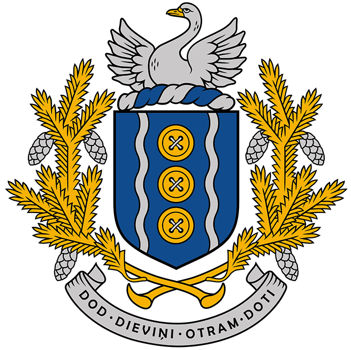 Podziņu dzimtas ģerbonis (Zilā laukā trīs ar sudraba diegu piešūtas zelta pogas pāļa virzienā starp diviem sudraba viļņotiem pavedienpāļiem. Vairogs pārsegts ar sudraba – zilu grīsti, kleinodā izaugošs sudraba gulbis ar izplestiem spārniem un zelta knābi. Vairogs sānos apņemts ar diviem zelta egles zariem, kuri krustojas zem vairoga, starp skujām sudraba čiekuri. Devīze ar melnu uz sudraba lentes: DOD DIEVIŅI OTRAM DOTI.) – reģistrēts 2020. gada 1. jūnijā.