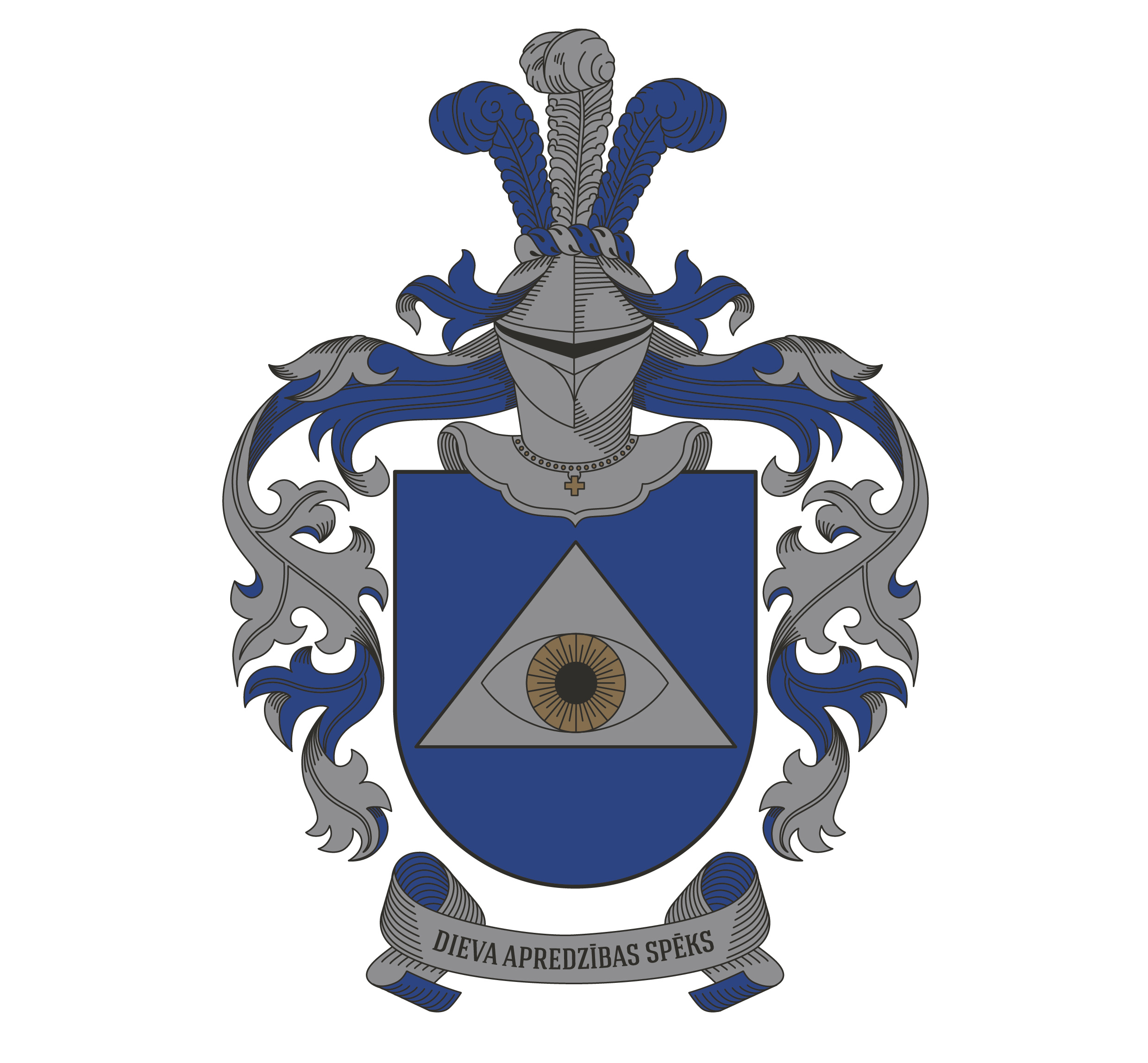 Kārļa Litaunieka dzimtas ģerbonis (Zilā laukā sudraba trīsstūris ar tādu pašu aci, zelta radzeni un melnu zīlīti. Sudraba smailļkivere ar zelta krusta medaljonu, pārsegta ar sudraba – zilu grīsti, kleinodā trīs strausa spalvas – zila, sudraba, zila; lambrekeni: sudrabs, zils. Devīze ar melnu uz sudraba-zilas lentes: DIEVA APREDZĪBAS SPĒKS.)