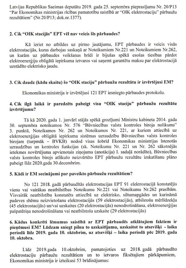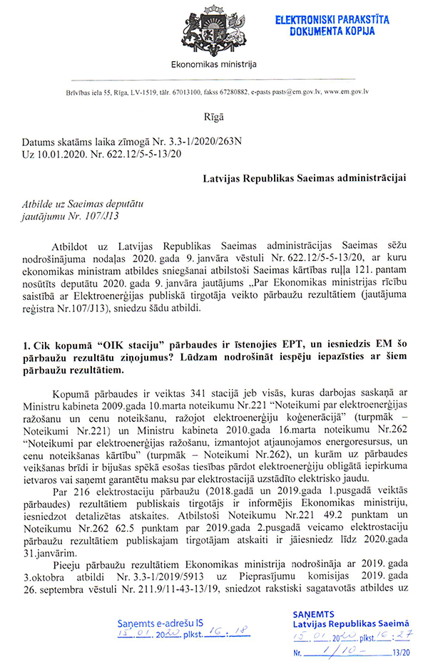 Tātad par deputātu Zariņa, Klementjeva, Kucina, Nikonova, Orlova un Kabanova steidzamo jautājumu ekonomikas ministram "Par Ekonomikas ministrijas rīcību saistībā ar elektroenerģijas tirgus likumā paredzēto "OIK staciju" līmeņatzīmju noteikšanu". Saņemtā rakstveida atbilde iesniedzējus neapmierina, ministrs informē, ka nevar ierasties uz mutvārdu atbildes sniegšanu, jo atrodas komandējumā ārvalstīs.
