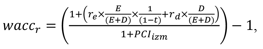 kur re ir pašu kapitāla atdeves likme [%]; E/(E+D) – pašu kapitāla attiecība pret kopējo (pašu un aizņemto) kapitālu, kuras vērtība tiek pieņemta 50%; rd – aizņemtā kapitāla atdeves likme [%]; D/(E+D) – aizņemtā kapitāla attiecība pret kopējo (pašu un aizņemto) kapitālu, kuras vērtība tiek pieņemta 50%; t – uzņēmumu ienākuma nodokļa likme; PCIizm – patēriņa cenu gada vidējo (janvāris–decembris) pārmaiņu piecu iepriekšējo kalendāro gadu vidējā vērtība [%]. Ja PCIizm vērtība ir negatīva, aprēķinā izmanto vērtību 0%.