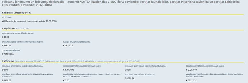 Politisko partiju apvienības "Jaunā VIENOTĪBA", reģ. Nr. 40008158358, vēlēšanu ieņēmumu un izdevumu deklarācija