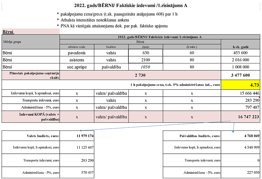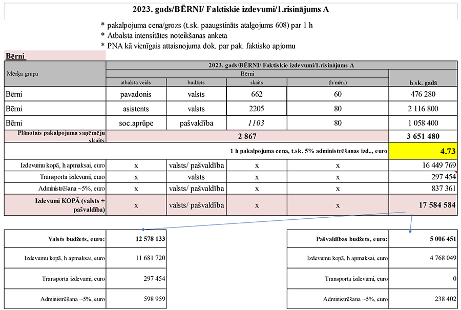 Izdevumi straujais pieaugums asistenta pakalpojuma nodrošināšanai 2016. un 2017.gadā samazinājās, jo 2016.gadā stājās spēkā Ministru kabineta 2015.gada 13.oktobra noteikumi Nr.592 "Grozījumi Ministru kabineta 2012.gada 18.decembra noteikumos Nr.942 "Kārtība, kādā piešķir un finansē asistenta pakalpojumu pašvaldībā"", kas paredzēja samazināt asistenta pakalpojuma apjomu no 10 stundām nedēļā uz 2 stundām nedēļā pasākumiem, kas saistīti ar brīvā laika pavadīšanu. 2018.gadā izdevumi asistenta pakalpojuma nodrošināšanai salīdzinājumā pret iepriekšējo gadu palielinājās par 4.0 milj. euro, pieaugums skaidrojums ne tikai ar klienta skaita pieaugumu (par aptuveni 500 personām pret iepriekšējo gadu), bet arī faktu, ka valstī tika paaugstināta minimālā alga (2017.gadā – 380 euro, 2018.gadā – 430 euro). 2019.gadā pieejamie valsts budžeta līdzekļi asistenta pakalpojuma nodrošināšanai salīdzinājumā pret iepriekšējo gadu palielinājās par 1.0 milj. euro (pakalpojuma saņēmēju skaita pieaugums aptuveni par 550 personām). Valsts pamatbudžeta līdzekļi asistenta pakalpojuma nodrošināšanai periodā no 2020. līdz 2023.gadam ir paredzēti 18.8 milj.5 euro apmērā (skatīt 2.tabulu).