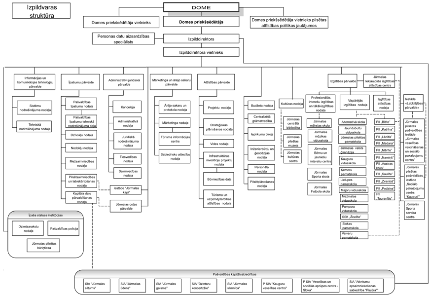 Jūrmalas pilsētas bāriņtiesas nosaukumu. 2.2. Saskaņā ar Zvejniecības likuma 5. panta ceturto daļu Jūrmalas pilsētas pašvaldība normatīvajos aktos noteiktajā kārtībā organizē valstij piederošo zvejas tiesību izmantošanu un pārzina privāto zvejas tiesību izmantošanu ūdeņos, kas atrodas pašvaldības administratīvajā teritorijā vai piekļaujas tai. Lai nodrošinātu efektīvu administratīvo resursu izmantošanu un operatīvāk veiktu Jūrmalas pilsētas pašvaldībai iedalītā zvejas rīku limita sadali privātpersonām, Jūrmalas pilsētas dome ir izveidojusi Jūrmalas pilsētas domes Rūpnieciskās zvejas nomas tiesību komisiju, kura izskatīs personu iesniegumus un citus ar rūpnieciskās zvejas tiesību nomu saistītus jautājumus un pieņems lēmumus par rūpnieciskās zvejas nomas tiesību un zvejas rīku limitu piešķiršanu. Tāpat Jūrmalas pilsētas dome ir apstiprinājusi Jūrmalas pilsētas domes nolikumu "Rūpnieciskās zvejas nomas tiesību komisijas nolikums", līdz ar to ir nepieciešams izdarīt grozījumus saistošajos noteikumos, papildinot Jūrmalas pilsētas domes izveidoto komisiju sarakstu un lēmējvaras struktūrshēmu. 2.3. Ar Jūrmalas pilsētas domes 2020. gada 24. septembra lēmumu Nr. 532 ir nolemts reorganizēt Jūrmalas pilsētas pašvaldības padotībā esošo profesionālās sporta ievirzes izglītības iestādi "Jūrmalas Sporta skola" un dibināt profesionālās sporta ievirzes izglītības iestādi "Jūrmalas Futbola skola". Jūrmalas pilsētas dome 2020. gada 24. septembrī ir apstiprinājusi Jūrmalas pilsētas domes nolikumu N. 27 "Jūrmalas Futbola skolas nolikums", kas stāsies spēkā 2020. gada 30. oktobrī, līdz ar to ir nepieciešams izdarīt grozījumus saistošajos noteikumos, papildinot Jūrmalas pilsētas domes iestāžu sarakstu un izpildvaras struktūrshēmu. 2.4. Ar Jūrmalas pilsētas domes 2020. gada 24. septembra lēmumu Nr. 459 (turpmāk – Lēmums) ir nolemts reorganizēt Jūrmalas pilsētas domes Labklājības pārvaldi, Jūrmalas pilsētas pašvaldības iestādi "Jūrmalas veselības veicināšanas un sociālo pakalpojumu centrs" un Jūrmalas pilsētas pašvaldības iestādi "Sprīdītis", nosakot, ka Jūrmalas pilsētas pašvaldības iestāde "Sprīdītis" daļēji ir Jūrmalas pilsētas domes Labklājības pārvaldes un Jūrmalas pilsētas pašvaldības iestādes "Jūrmalas veselības veicināšanas un sociālo pakalpojumu centrs" Lēmumā noteikto tiesību, saistību un funkciju pārņēmēja. Ņemot vērā minētās izmaiņas, ir nolemts mainīt Jūrmalas pilsētas pašvaldības iestādes "Sprīdītis" nosaukumu uz Jūrmalas pilsētas pašvaldības iestāde "Sociālo pakalpojumu centrs "Kauguri", līdz ar to, nepieciešams iestādes nosaukumu mainīt arī saistošajos noteikumos. |