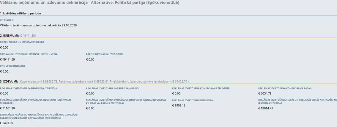 Politiskās partijas "Alternative", reģ. Nr. 40008113748, vēlēšanu ieņēmumu un izdevumu deklarācija