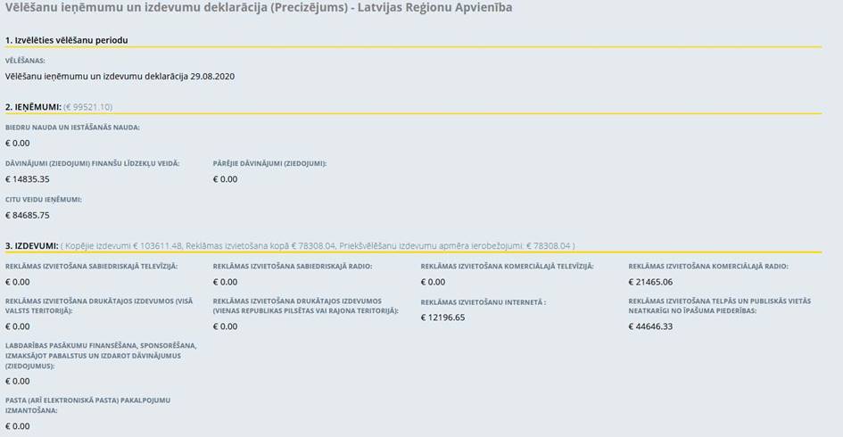 Politisko partiju apvienības "Latvijas Reģionu Apvienība", reģ. Nr. 50008221771, precizēta vēlēšanu ieņēmumu un izdevumu deklarācija
