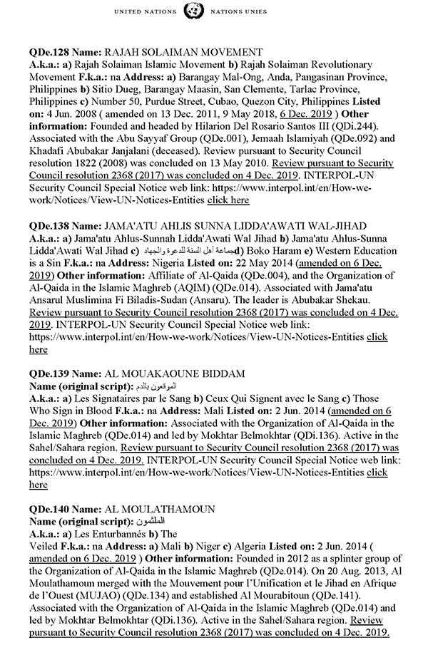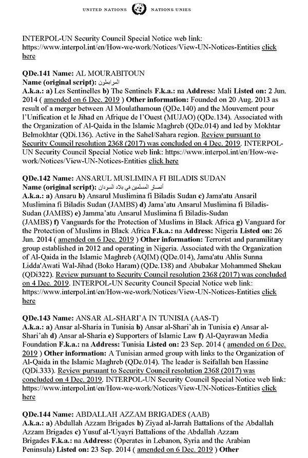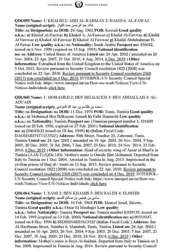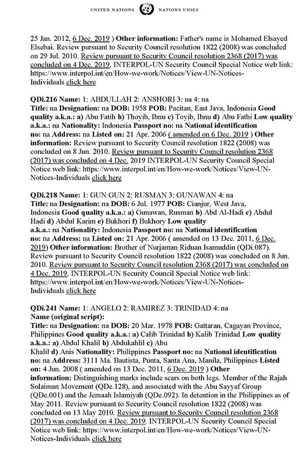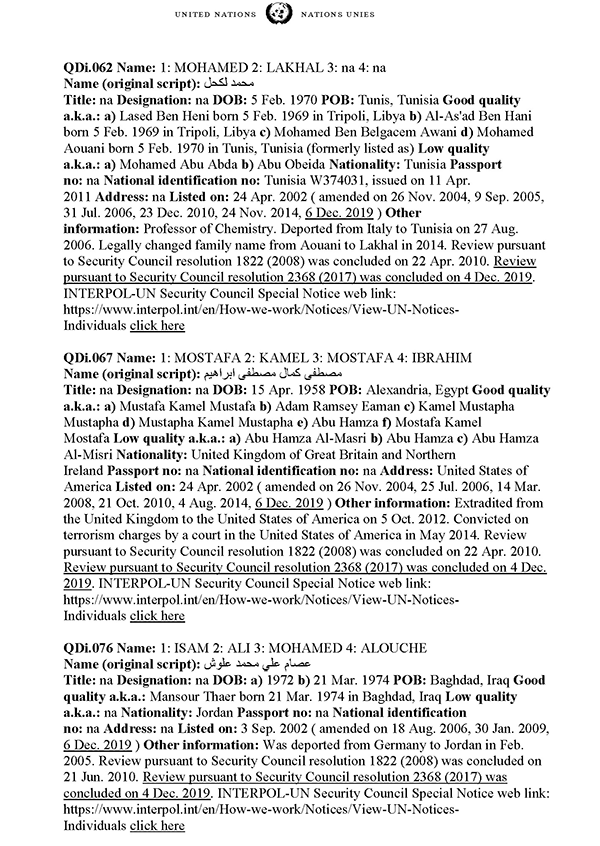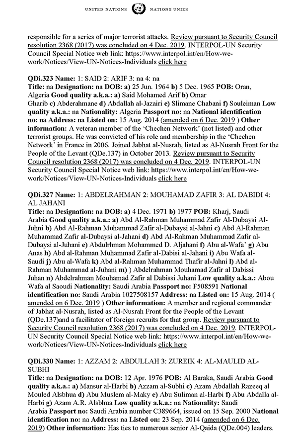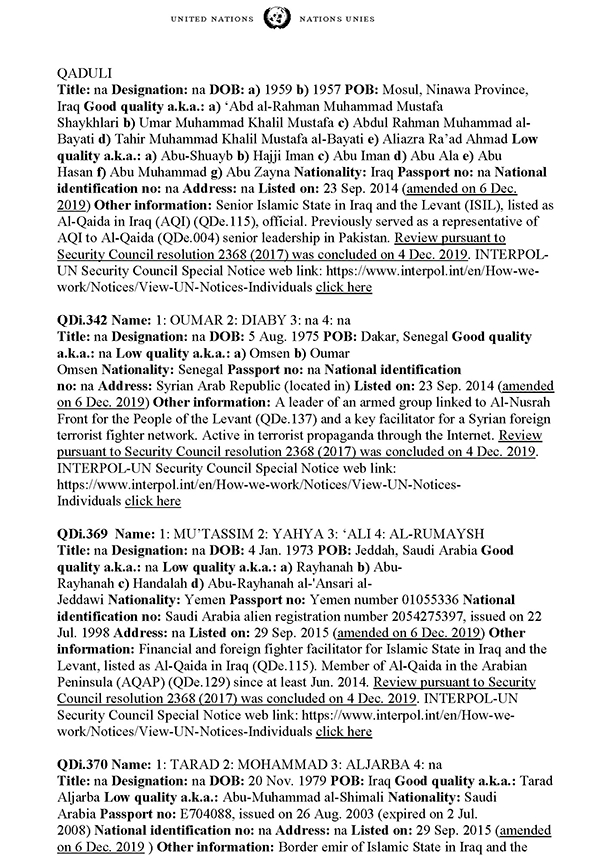 2020. gada 4. februārī ANO Drošības padomes Komiteja sankciju režīmam pret teroristu organizācijām ISIL (Da’esh) un Al-Qaida, kas izveidots saskaņā ar ANO Drošības padomes rezolūcijām 1267 (1999), 1989 (2011) un 2253 (2015), papildināja personu sarakstu, pret kurām noteiktās sankcijas. Lūgums skatīt ANO notu un skaidrojošo informāciju pielikumā.