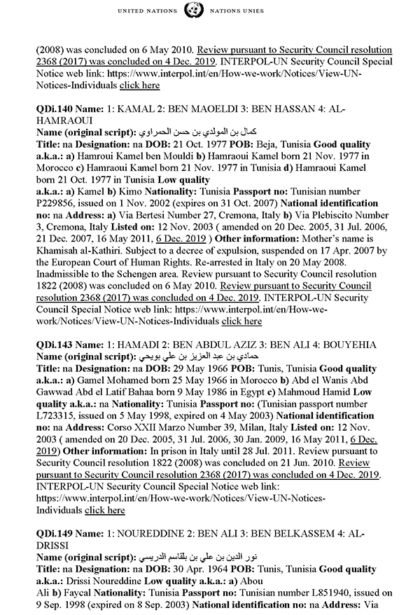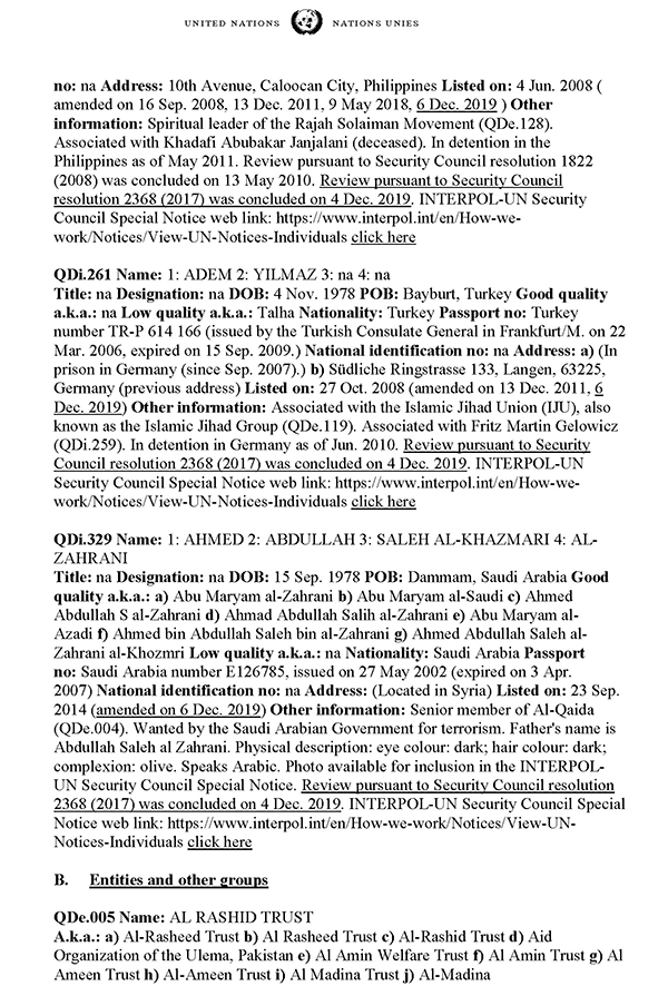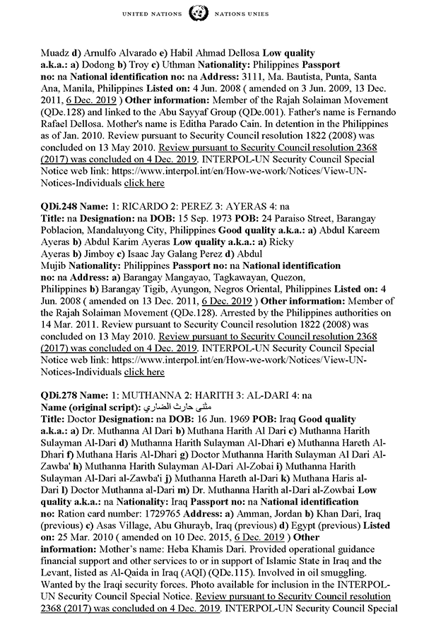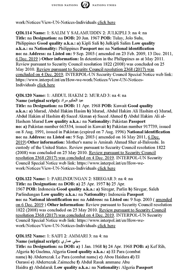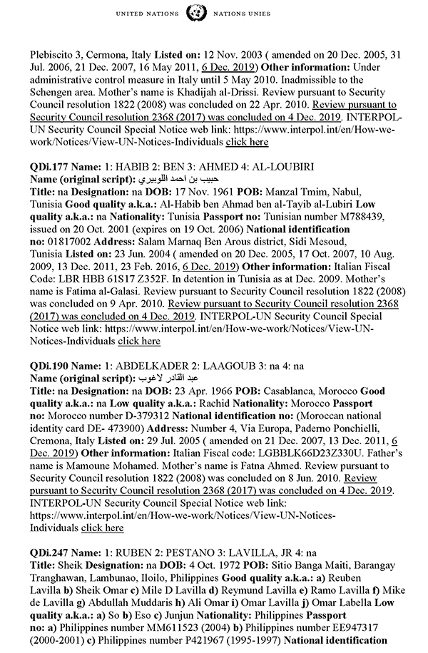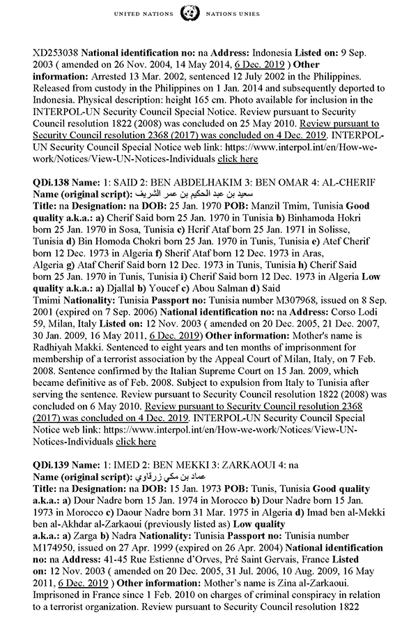 2020. gada 4. februārī ANO Drošības padomes Komiteja sankciju režīmam pret teroristu organizācijām ISIL (Da’esh) un Al-Qaida, kas izveidots saskaņā ar ANO Drošības padomes rezolūcijām 1267 (1999), 1989 (2011) un 2253 (2015), papildināja personu sarakstu, pret kurām noteiktās sankcijas. Lūgums skatīt ANO notu un skaidrojošo informāciju pielikumā.