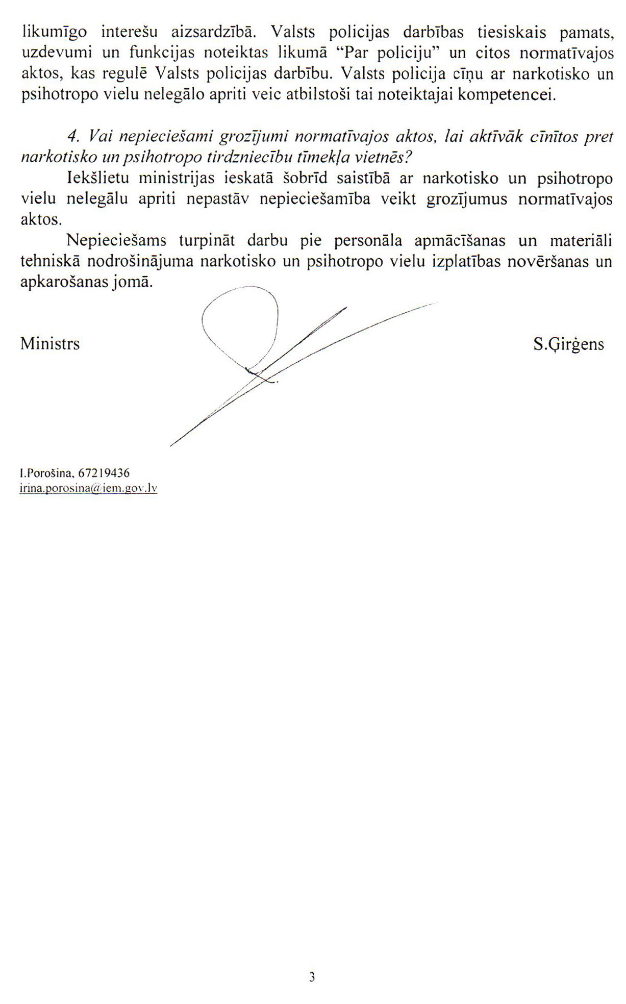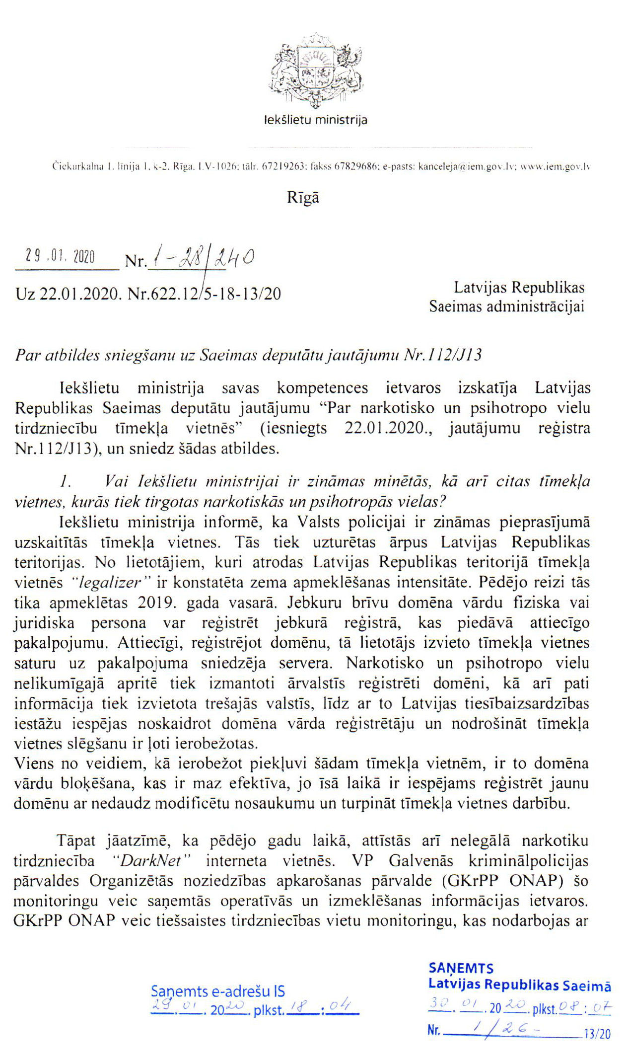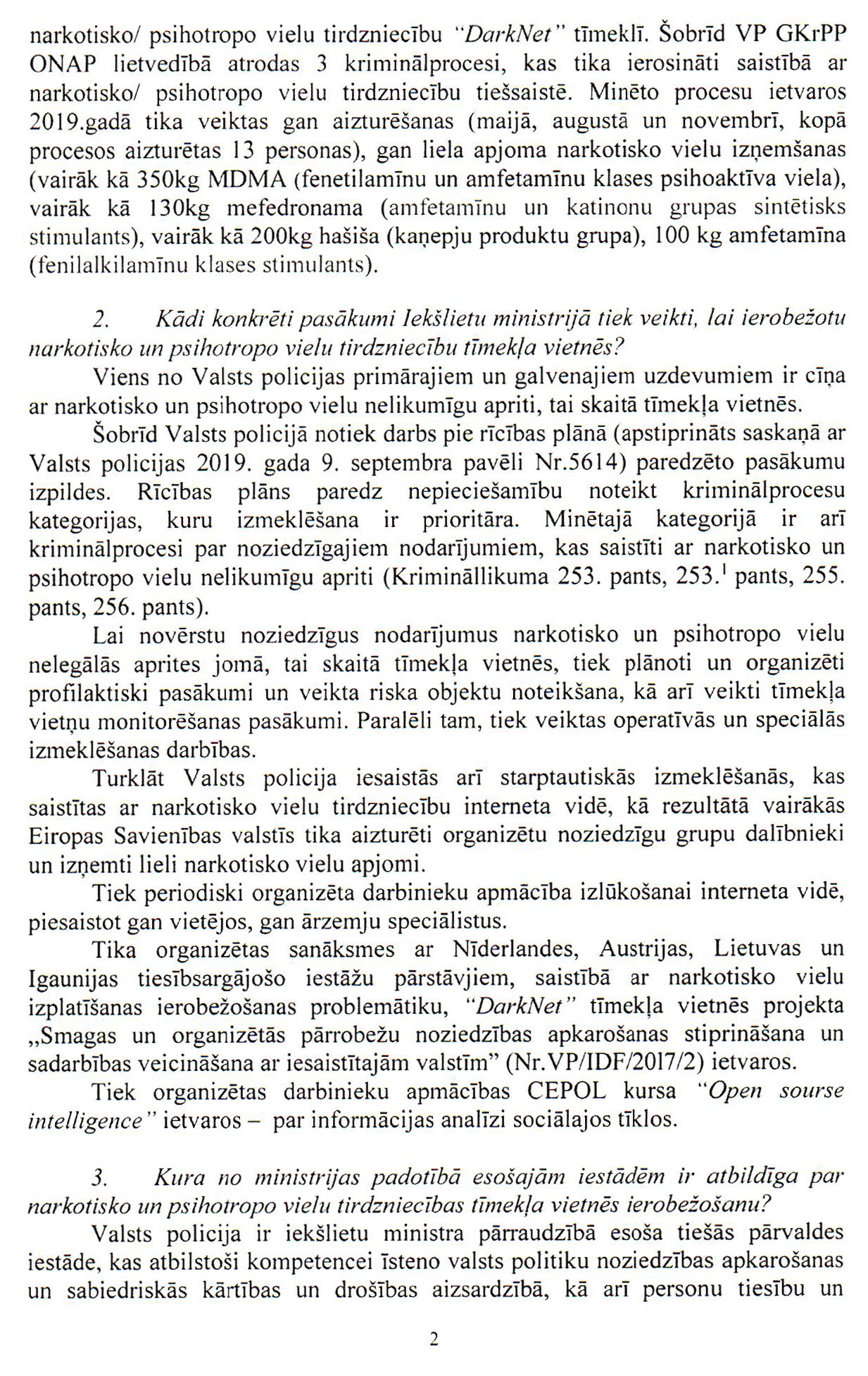 Par deputātu Ādamsona, Zariņa, Orlova, Ločmeles-Luņovas un Rubika jautājumu iekšlietu ministram "Par narkotisko un psihotropo vielu tirdzniecību tīmekļa vietnēs". Saņemtā rakstveida atbilde iesniedzējus neapmierina, bet mutvārdos deputāti papildjautājumus uzdot nevēlas.