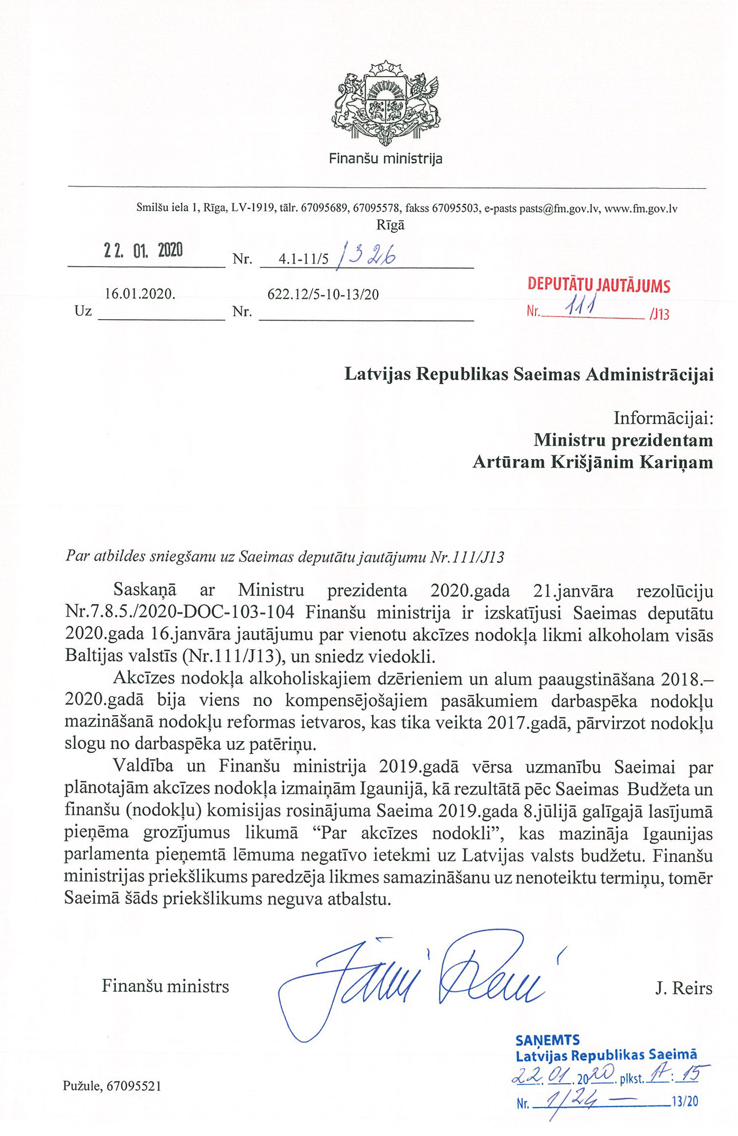 Par deputātu Reiznieces-Ozolas, Valaiņa, Krauzes, Bergmaņa un Vucāna jautājumu Ministru prezidentam "Par vienotu akcīzes nodokļa likmi alkoholam visās Baltijas valstīs". Saņemtā rakstveida atbilde iesniedzējus neapmierina, bet mutvārdos deputāti papildjautājumus uzdot nevēlas.