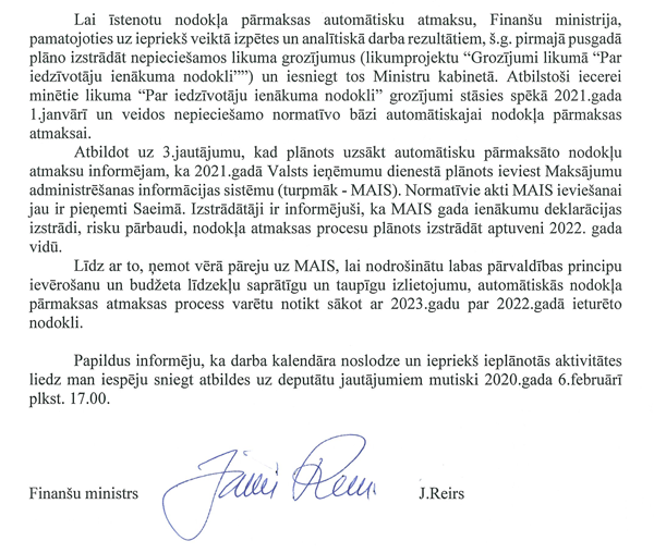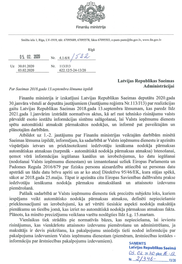 Par deputātu Liepiņas, Stepaņenko, Gobzema, Sprūdes un Daudzes jautājumu finanšu ministram "Par Saeimas 2018. gada 13. septembra lēmuma izpildi". Saņemtā rakstveida atbilde iesniedzējus apmierina.