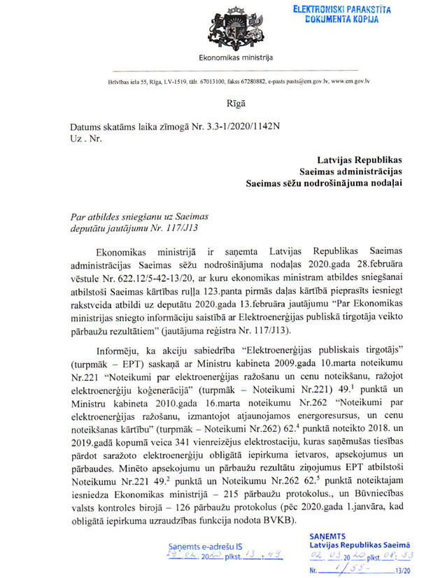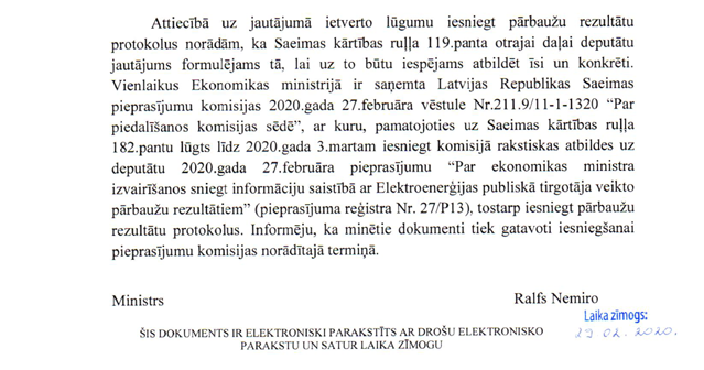 Ir ieradies ekonomikas ministrs Ralfs Nemiro. Taču, ministra kungs, nav ieradušies deputāti Zariņš, Tutins, Agešins, Krišāns un Kucins, kuri ir iesnieguši jums jautājumu "Par Ekonomikas ministrijas sniegto informāciju saistībā ar Elektroenerģijas publiskā tirgotāja veikto pārbaužu rezultātiem".