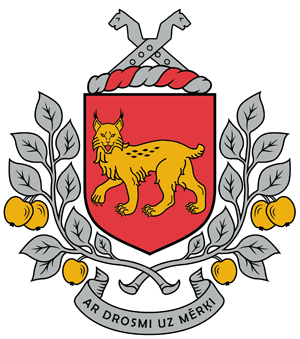 Lūsiņu dzimtas ģerbonis (Sarkanā laukā ejošs zelta lūsis ar galvu pretskatā un sarkanu mēli. Vairogs pārsegts ar sudraba-sarkanu grīsti, kleinodā slīpi sakrustoti sudraba "jumta āži". Vairogs sānos apņemts ar diviem sudraba ābeles zariem ar zelta āboliem, zari krustojas zem vairoga. Devīze ar melnu uz sudraba lentes: AR DROSMI UZ MĒRĶI.) – reģistrēts 2020. gada 16. martā.