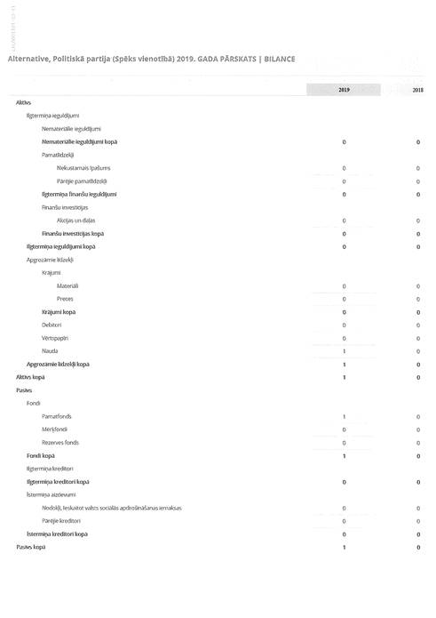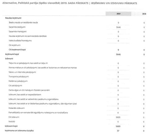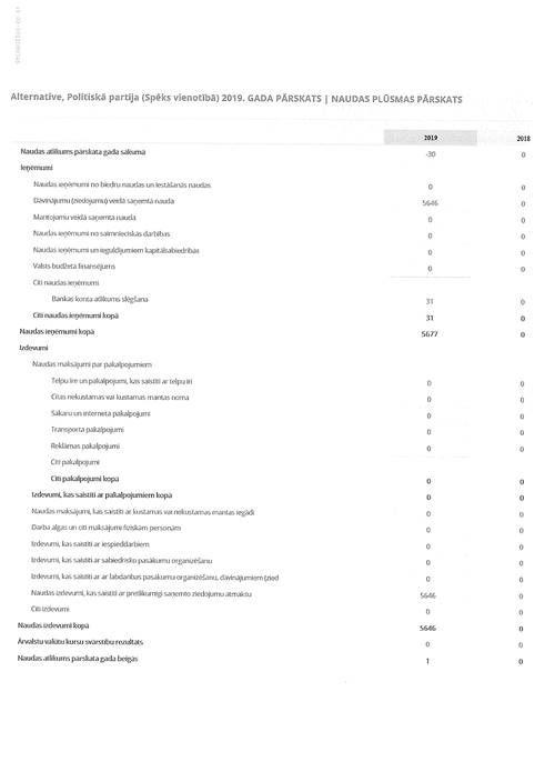 Politiskās partijas "Alternative", reģ. Nr. 40008113748, gada pārskats par 2019. gadu