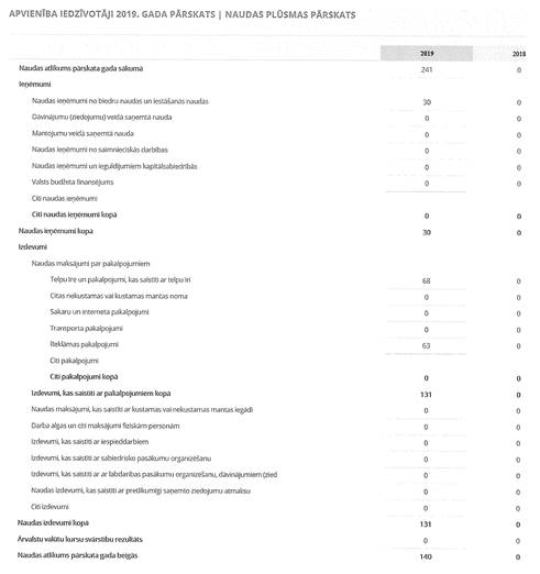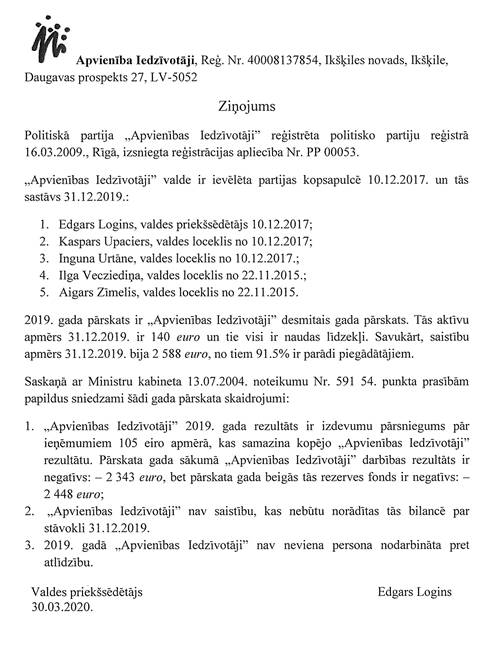 Politiskās partijas "APVIENĪBA IEDZĪVOTĀJI", reģ. Nr. 40008137854, gada pārskats par 2019. gadu