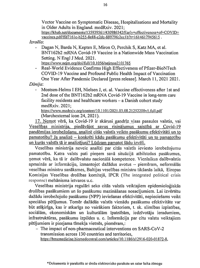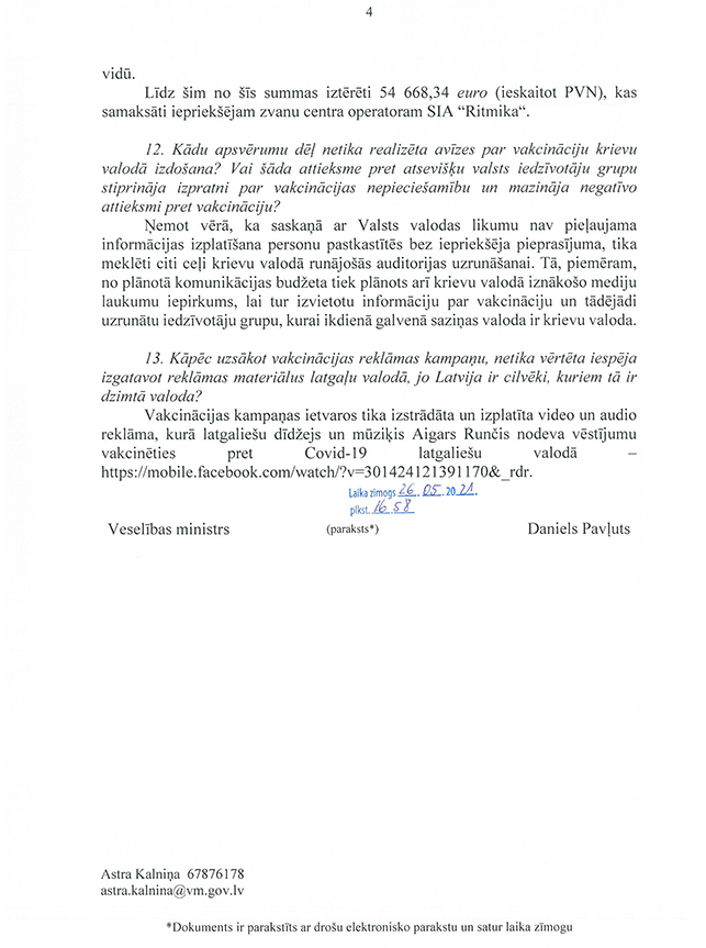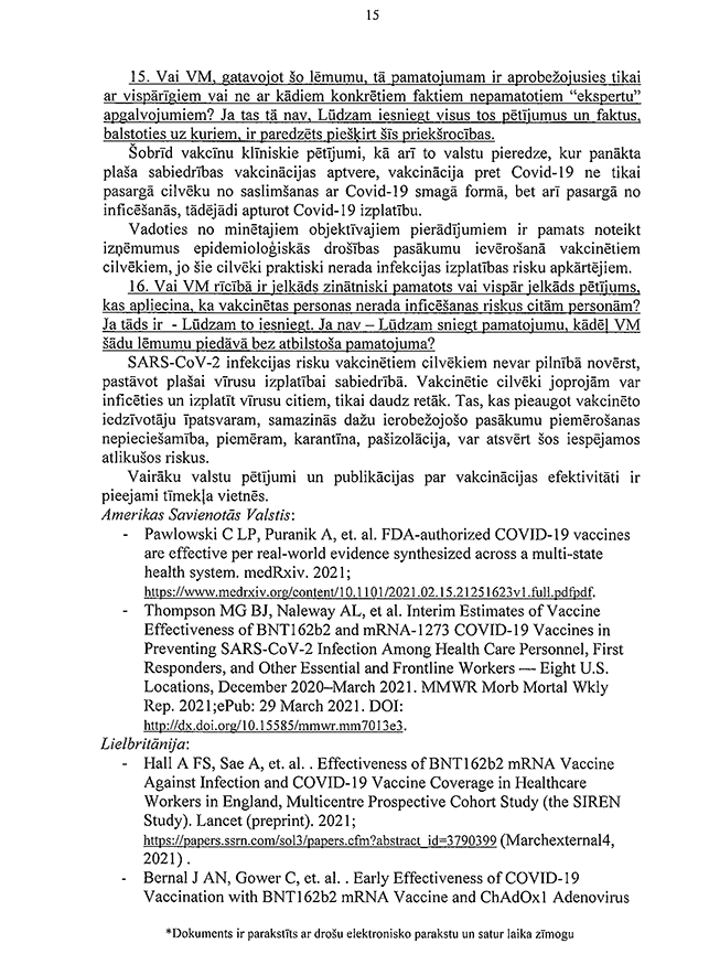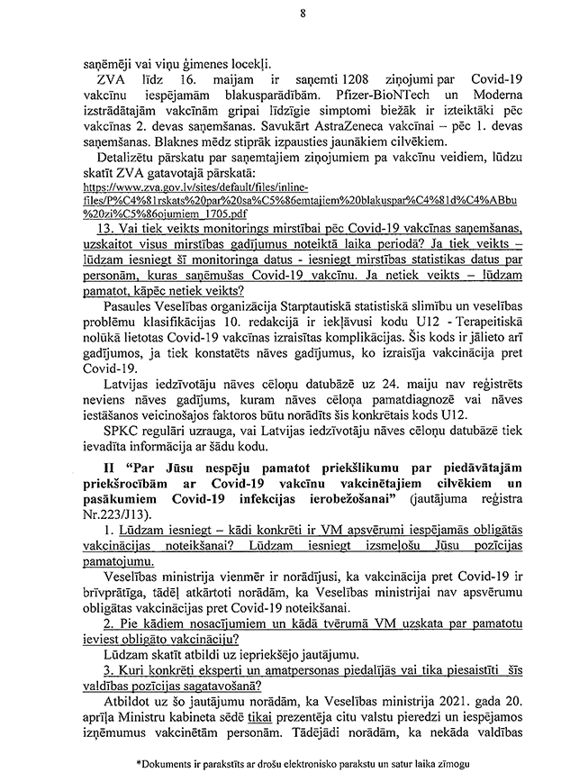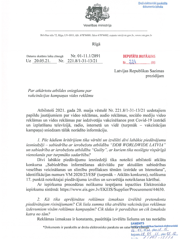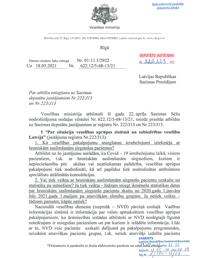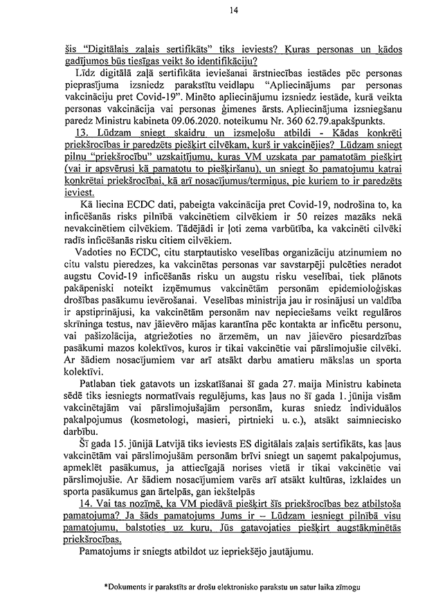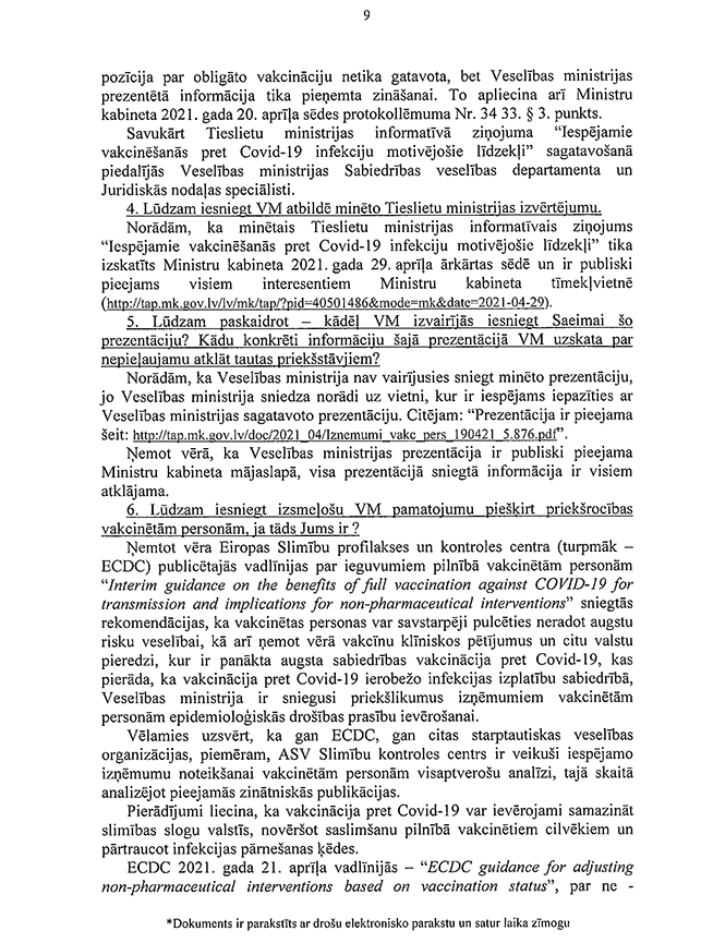 Esmu ļoti rūpīgi iepazinies ar šo vēstuli, kolēģi. Šajā vēstulē nekas nav pateikts par to, ka pilnībā vakcinētiem cilvēkiem vai tiem, kas ir pārslimojuši, ir kaut kādi riski skatīties to čempionātu. Nav nekā. Te ir tikai pateikts, ka tiem, kas nav vakcinējušies, ir riski, bet par to Saeima nekad nav lēmusi, to Saeima nav ierosinājusi. Un tālāk – izrādās, ka tas īstais iemesls, pēc Veselības ministrijas viedokļa, ir tas, ka, lūk, nav likuma grozījumu, kas Veselības ministrijai ļautu izsniegt cilvēkiem tās apliecības.