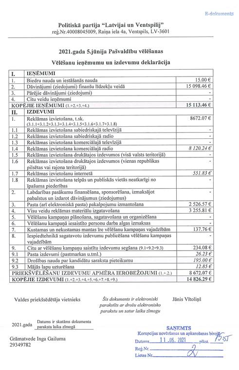 Politiskās partijas "Latvijai un Ventspilij", reģ. Nr. 40008045009, vēlēšanu ieņēmumu un izdevumu deklarācija