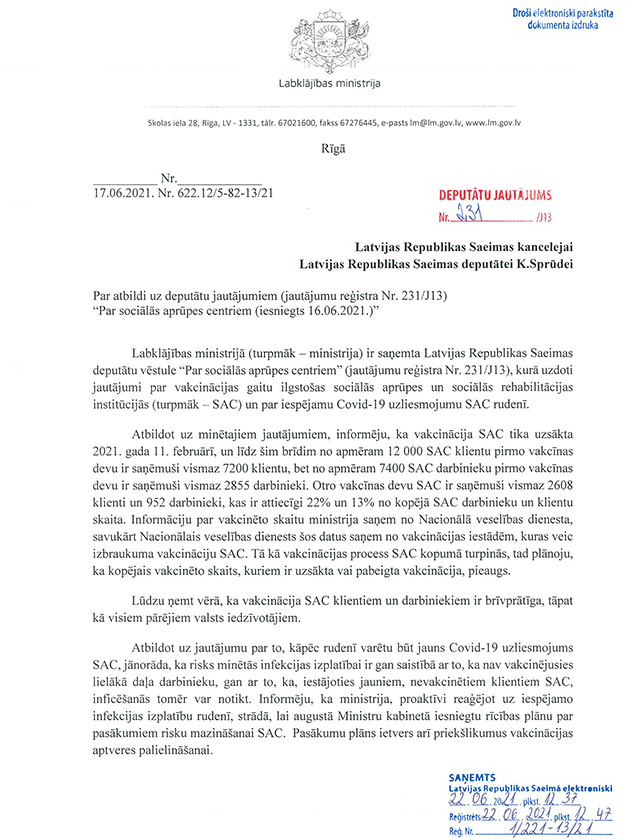 Tātad šis pieprasījums sastāv no vairākiem blokiem. Viens bloks ir saistībā ar obligāto vakcināciju, ko savulaik... valdības sēdē maijā jau tika izskatīts šis jautājums... Kāda tad ir pamatotība un kāda ir valdības pozīcija. Pēc tam saistībā ar iespējamām priekšrocībām vakcinētajiem – kāds tur ir pamatojums, kā valdība redz, kādas priekšrocības un kādā veidā varētu tikt īstenotas. Un kāpēc tieši vakcinētajiem un kāpēc ne pārējiem, kāpēc tieši tikai vakcinētajiem. Par to, kā praktiski pēc tam to var īstenot. Tad ir jautājums par digitālo sertifikātu un tā praktisko pielietojamību. Un vēl viens bloks bija arī par to, vai valdība, pieņemot savus viedos un pārdomātos, ilgi pārdomātos, lēmumus, ņem vērā arī citu valstu pieredzi, tajā gūtās atziņas cīņā ar kovida sērgu. Šādi bloki.