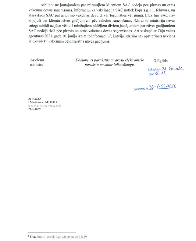 Tālāk. Runājot par priekšrocībām. Tas, ko mēs vēlējāmies noskaidrot, tā kā atkal kaismīgi tika stāstīts, ka vakcinētās personas nerada nekādus riskus, ‒ mēs palūdzām iesniegt šos pētījumus, kas tad to apliecinātu, lai nebūtu tā, ka tie ir vienkārši tukši vārdi. Un atbildē bija iesniegta virkne interneta saišu, kur varētu iepazīties ar pētījumiem. Diemžēl šie visi pētījumi bija par kaut ko citu, nevis par riskiem, kurus vakcinētas personas nerada citiem, bet par šo risku samazinājumu, kas rodas pašām vakcinētajām personām.