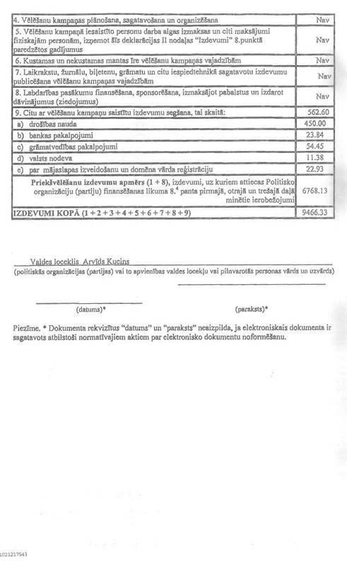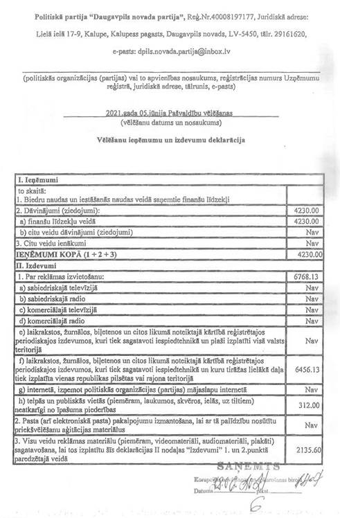 Politiskās partijas "Daugavpils novada partija", reģ. Nr. 40008197177, vēlēšanu ieņēmumu un izdevumu deklarācija