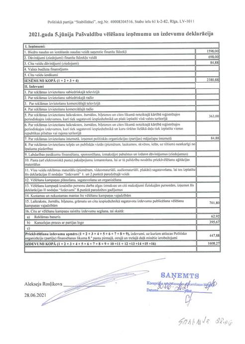 Politiskās partijas "Politiskā partija "Stabilitātei!"", reģ. Nr. 40008304516, vēlēšanu ieņēmumu un izdevumu deklarācija