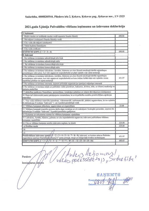 Politiskās partijas "Sadarbība", reģ. Nr.40008205544, vēlēšanu ieņēmumu un izdevumu deklarācija