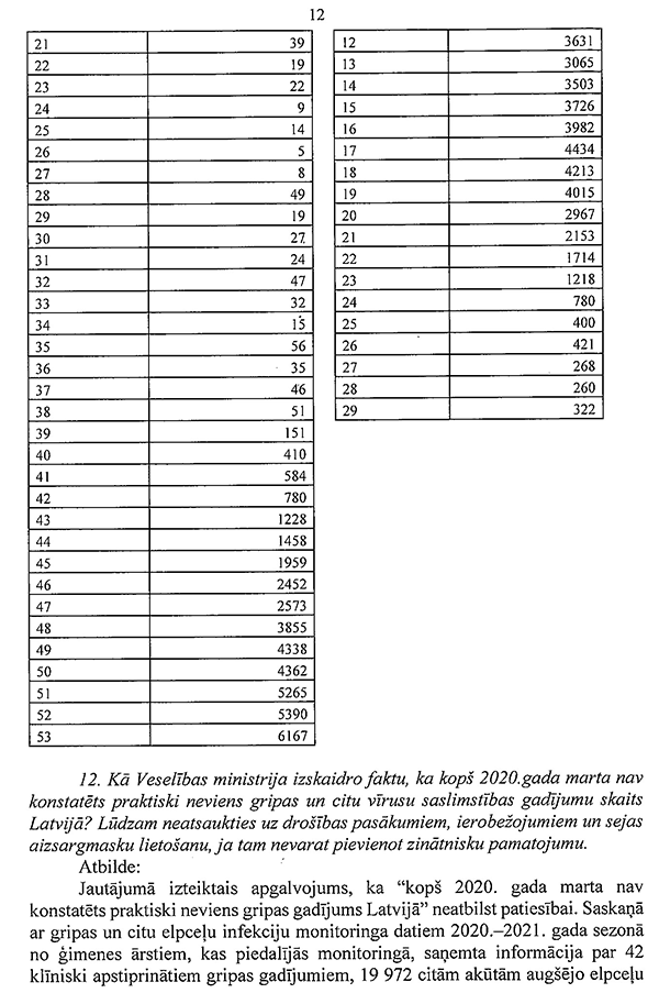 2020. gada oktobris. Ko mēs redzējām un dzirdējām Latvijas medijos? Mums nebija gripas vakcīnu, to trūkstot vēsturiski zemā pieprasījumu dēļ, tā mums teica Veselības ministrijas Vides veselības nodaļas vadītāja Jana Feldmane. Viņa to komentēja un mierināja, ka riska grupām, ārstniecības personām, sociālās aprūpes centru klientiem un darbiniekiem rezervētās vakcīnas būs pieejamas. Savukārt visiem senioriem, kas šogad vēlēsies vakcinēties pret gripu, acīmredzot vakcīnu nepietiks. Ko tas nozīmē? Februārī pirmais gadījums ar nāvējošo vīrusu, kā mūs visi mediji biedē, bet mums pat nav vakcīnu pret gripu... it sevišķi tas inficē cilvēkus ar hroniskām slimībām.