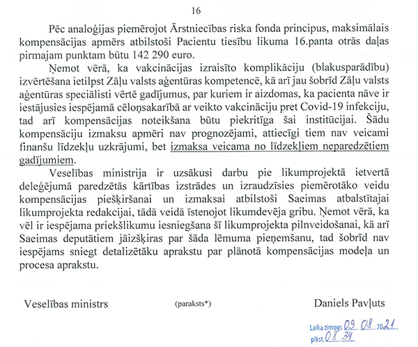 Mēs kopā ar pārējiem deputātiem gribējām noskaidrot, precizēt, kas īsti ir tas, ko Pavļuts bija domājis ar šo frāzi, un saņēmām arī atbildi. Publiskā atbilde, kur Pavļuts attiecīgi... 27. janvārī, kad viņš sniedza atbildi... atbildēja, ka viena no brīvībām, kas tiek aizsargātas un respektētas demokrātiskā valstī, ir personas brīvība lēmumu pieņemšanā attiecībā uz sevi un savu veselību, personas tiesības pieņemt lēmumu attiecībā uz ārstniecību un ārstniecībā izmantojamo metodi. Pacientu tiesību likums noteic, ka ārstniecība ir pieļaujama tikai tādos gadījumos, ja pacients tai ir devis informētu piekrišanu. Tādējādi Latvijā, respektējot cilvēka pamattiesības un pamatbrīvības, vakcinācija tiek balstīta uz informētas piekrišanas principu.