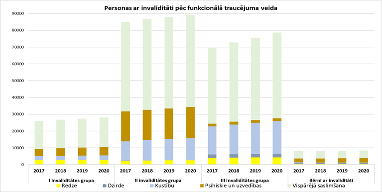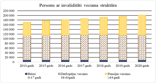 Personu ar invaliditāti skaits ik gadu turpina pieaugt (skatīt 2.tabulu un 1.attēlu) un tāpat to īpatsvars patstāvīgo iedzīvotāju skaitā turpina pieaugt ar katru gadu. 2014.gadā personu ar invaliditāti īpatsvars no kopējā valsts iedzīvotāju skaita bija 8,6%, 2016.gadā – 8,8%, bet 2020.gada beigās jau 10,5%15. Lielākais personu ar invaliditāti īpatsvars ir tieši darbspējas vecumā, tomēr būtiskāks pieaugums pēdējo gadu laikā ir novērojams tieši vecuma grupā 65 +. Bērnu ar invaliditāti īpatsvars starp personām ar invaliditāti jau vairākus gadus ir 4% ietvarā, un arī absolūtos skaitļos bērnu ar invaliditāti skaits ir stabils. Personu ar invaliditāti skaita pieaugums LM vērtējumā ir saistīts ar sabiedrības novecošanos kopumā, izmaiņām invaliditātes politikā, t.sk. dažādu atbalsta pasākumu ieviešanu, pārmaiņām sociālekonomiskajā situācijā, kā arī izmaiņām citās rīcībpolitikās, kur atsevišķās situācijās invaliditātes statuss noteikts kā priekšnosacījums atbalsta saņemšanai. Pētījumā "Muskuļu un skeleta sistēmas slimību izmaksu novērtēšana un rekomendācijas"16 secināts, ka veselības aprūpes jomā pastāv nepietiekama svarīgu pakalpojumu pieejamība personām ar muskuļu un skeleta sistēmas saslimšanām, kas ir viens no iemesliem personu ar invaliditāti skaita pieaugumam. Tomēr iemesli, kāpēc pieaug personu ar invaliditāti skaits, nav viennozīmīgi meklējami tikai veselības aprūpes jomā.