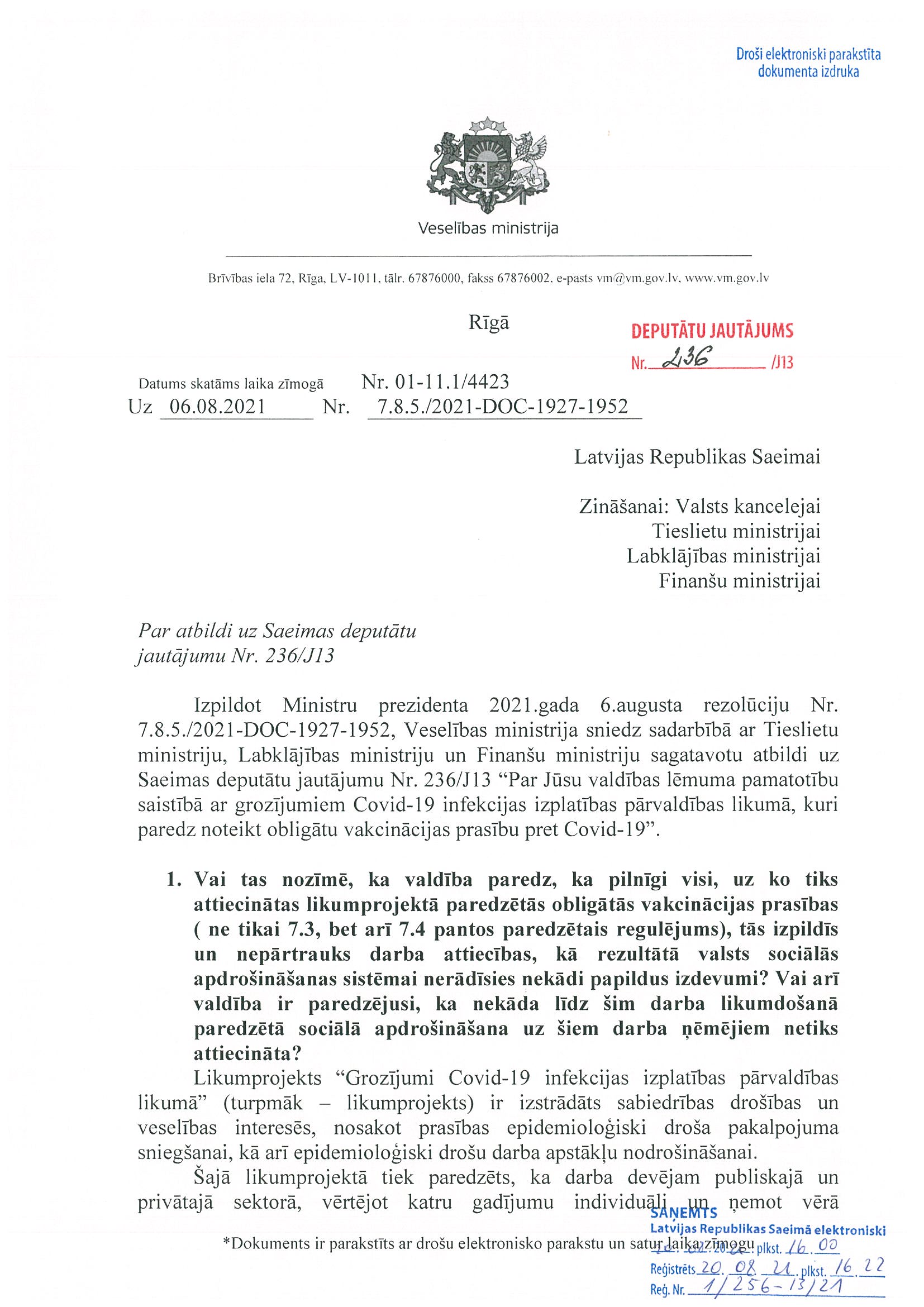 Latvijas Republikas 13. Saeimas ārkārtas sesijas attālinātā sēde 2021. gada 19. augustā (pulksten 16.10)