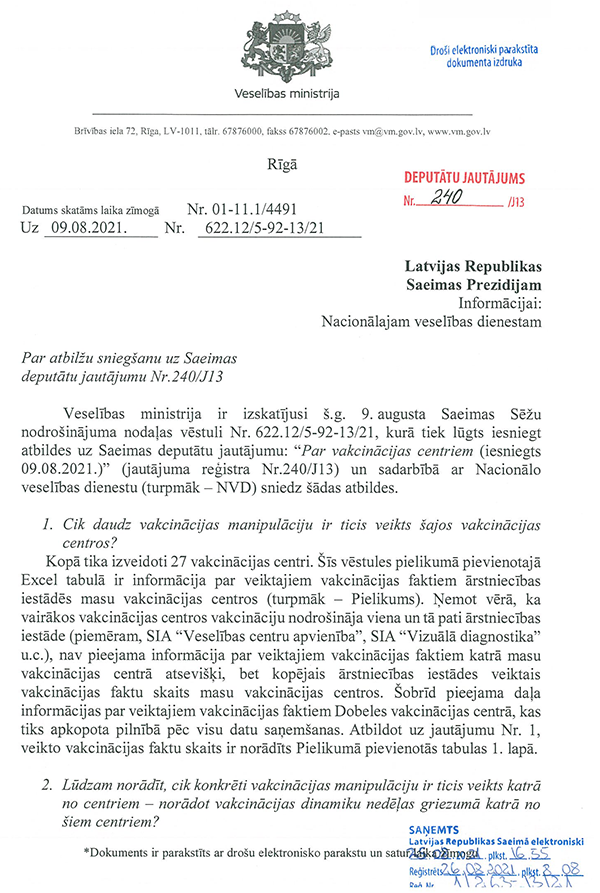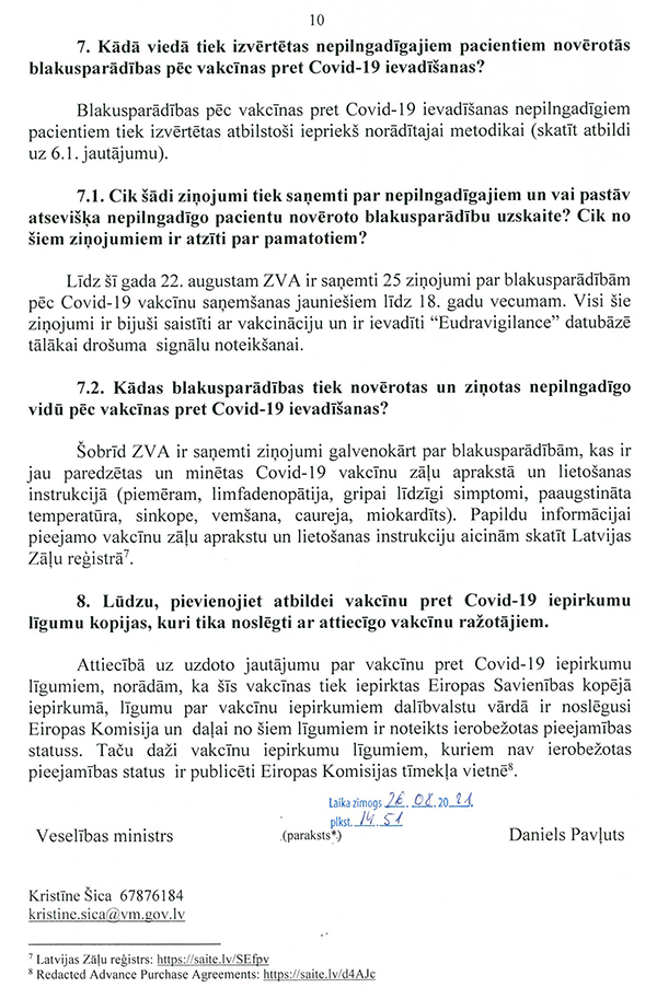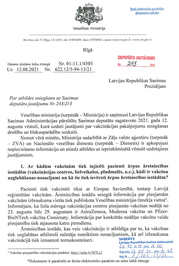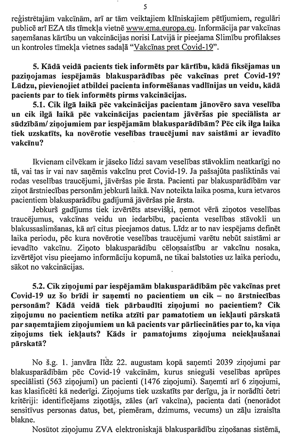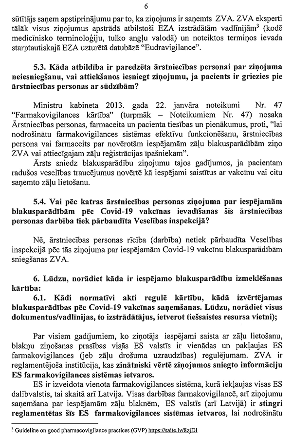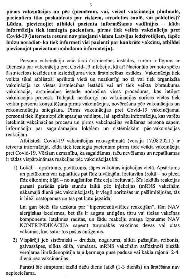 Piektkārt, perspektīvā ir jāpiedāvā iespēja visām jau vakcinētajām personām, kas to vēlēsies, pēc zināma laika saņemt vēl papildu (trešo) poti imūnsistēmas nostiprināšanai. Tātad Latvijai jau tagad ir jāiepērk attiecīgās devas. Un es saprotu, ka tik daudz devu Latvijai jau patlaban ir. Starp citu, Lietuva tieši diskutē šo jautājumu, tā ka mums ir jāseko līdzi attīstībai.