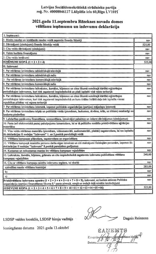 Politiskās partijas "Latvijas Sociāldemokrātiskā strādnieku partija", reģ. Nr. 40008046127, 2021.gada 11.septembra vēlēšanu ieņēmumu un izdevumu deklarācija