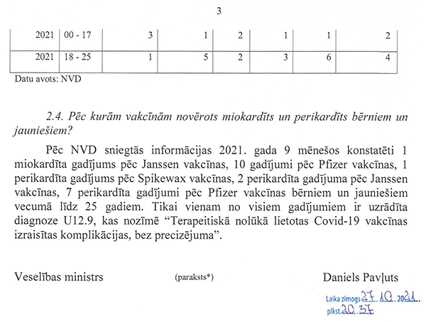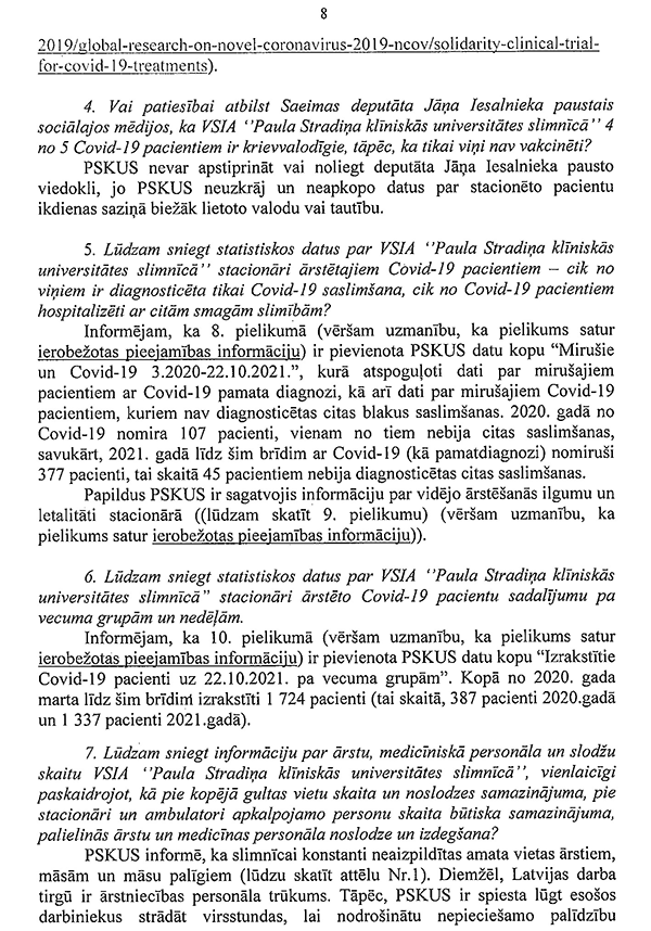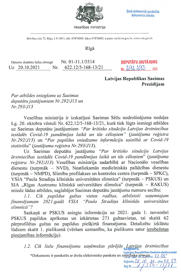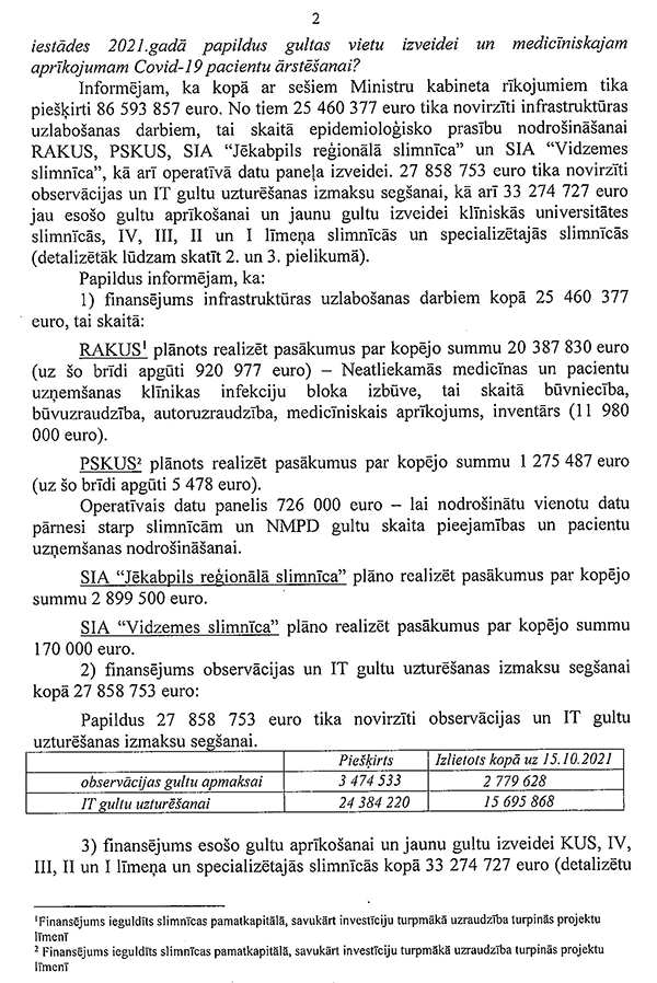 Un par to atbildīgs ir Kariņš ar savu daudzo naudu. Viņš teica, ka ir daudz naudas. Daudz naudas zagšanai? 500 miljonus, pusmiljardu, šī valdība it kā ieguldīja veselības aprūpes sistēmā – it kā! –, bet simt gultas ir acīmredzot vienīgais, kas ir iegādāts par šiem 500 miljoniem. Mums ir kolapss – pie tūkstoš cilvēkiem slimnīcā. Un 500 miljoni ir izzagti – tāpat kā ir nozagti visi pārējie 3,5 aizņemtie miljardi.