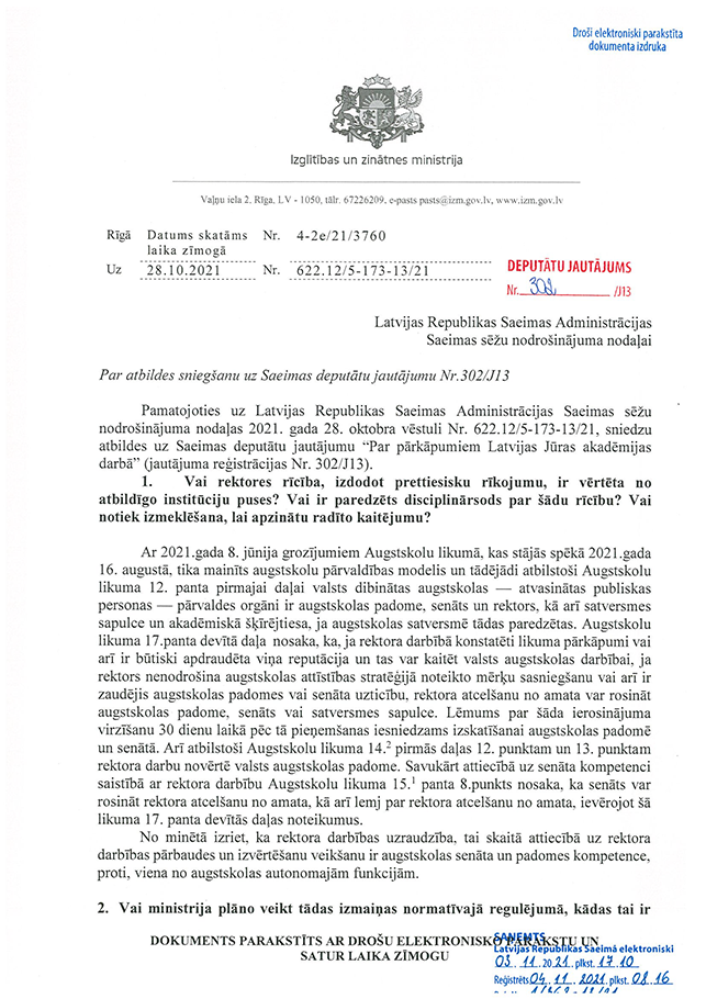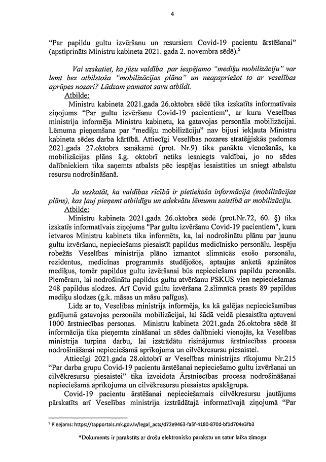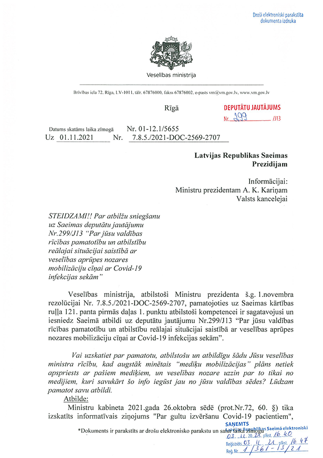 Sēdes vadītāja. Labrīt, godātie kolēģi! Sākam Latvijas Republikas Saeimas 2021. gada 4. novembra attālināto ārkārtas sēdi.