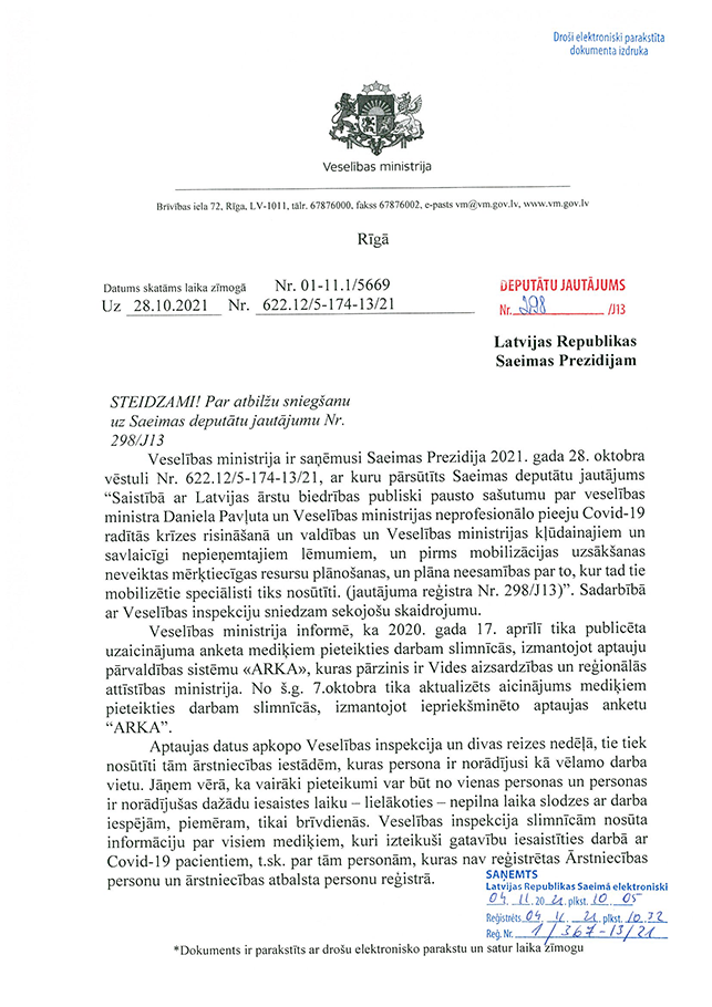 Mēs atbalstām to, ka valdība sniedza palīdzīgu plecu uzņēmējiem šajā grūtajā periodā un nolēma atbalstīt to, ka darbnespējas lapu izsniedz no pirmās dienas, bet mēs nevaram piekrist tam, kādā veidā... ka Labklājības ministrija aicina piespiedu kārtā vakcinēties cilvēkus.
