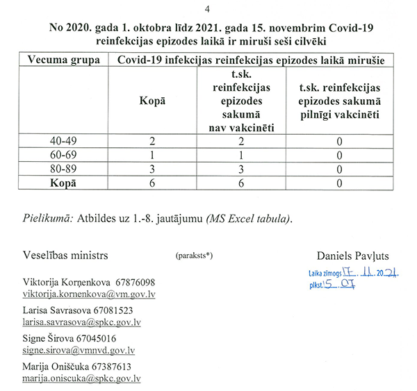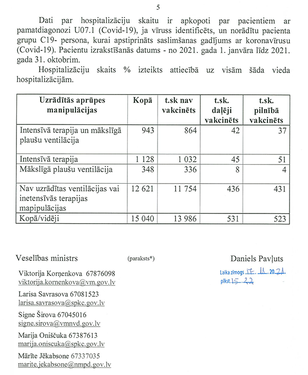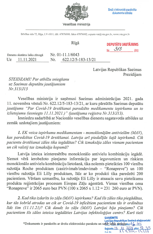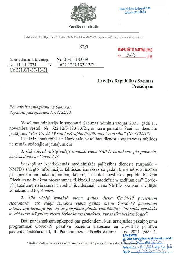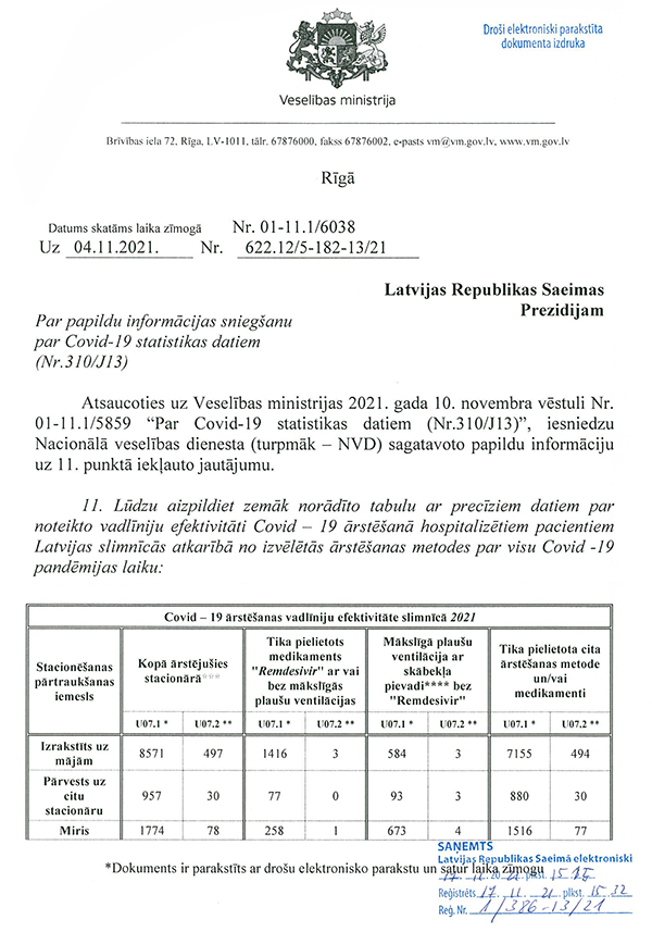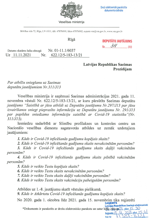 Un deputāti Jūlija Stepaņenko, Māris Možvillo, Karina Sprūde, Ieva Krapāne un Ļubova Švecova ir iesnieguši jautājumu veselības ministram Pavļutam "Par Covid-19 pacientu statistikas datiem".