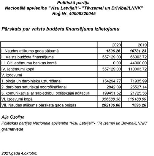Politiskās partijas "Nacionālā apvienība "Visu Latvijai!" - "Tēvzemei un Brīvībai/LNNK"", reģ. Nr. 40008220045, 2020.gada valsts budžeta izlietojuma pārskats