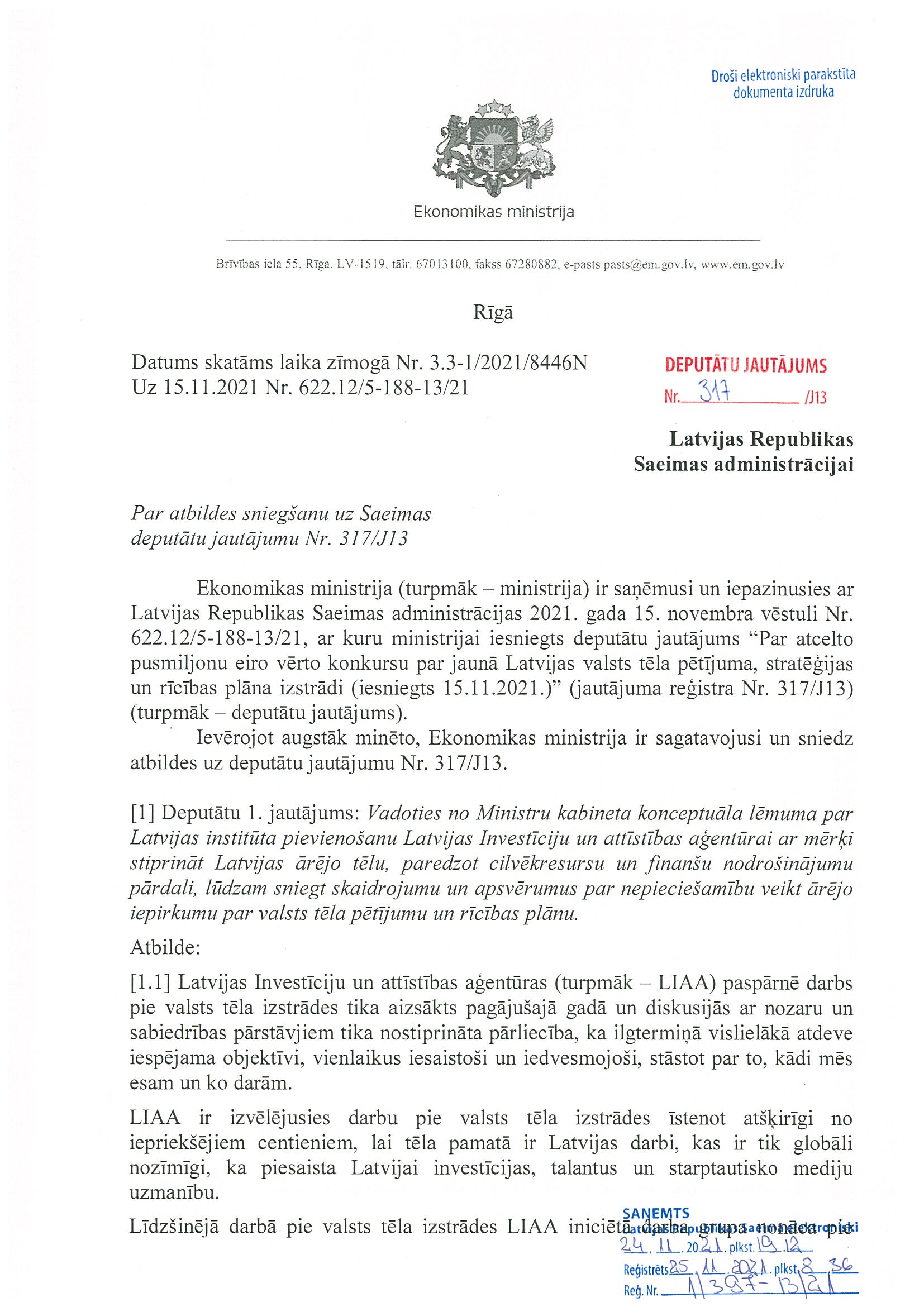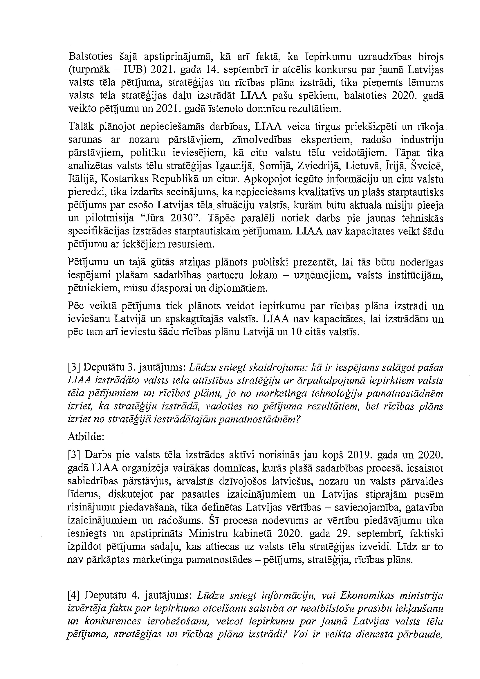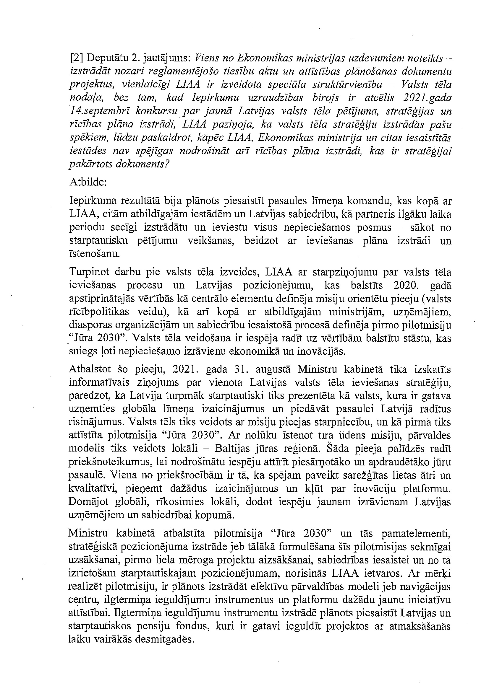 Kas pats interesantākais – pat ja mēs runājam par saviem priekšlikumiem, pat par koalīcijas iesniegtajiem priekšlikumiem, argumentācijas, kāpēc tie tiek atbalstīti, praktiski nav. Un kas pats interesantākais – ja jūs pasekosiet līdzi tai ķēdītei tālāk valdībā, vismaz publiskajā daļā, arī tur šo skaidrojumu pēc būtības nav. Ja mēs pasekojam līdzi, kā kopumā notika budžeta pieņemšanas process (kā to noprecizēja Latvijas Tirdzniecības un rūpniecības kamera – par neskaidro procesu), kā ir ticis vadīts budžets, tad šobrīd šajā sēdē, es redzu, ir 85 dalībnieki, un es nekļūdīšos, sakot, ka šeit, šajā sēdē, nepiedalās neviens ministrs, nav pat formāli pieslēdzies šajā attālinātajā režīmā.