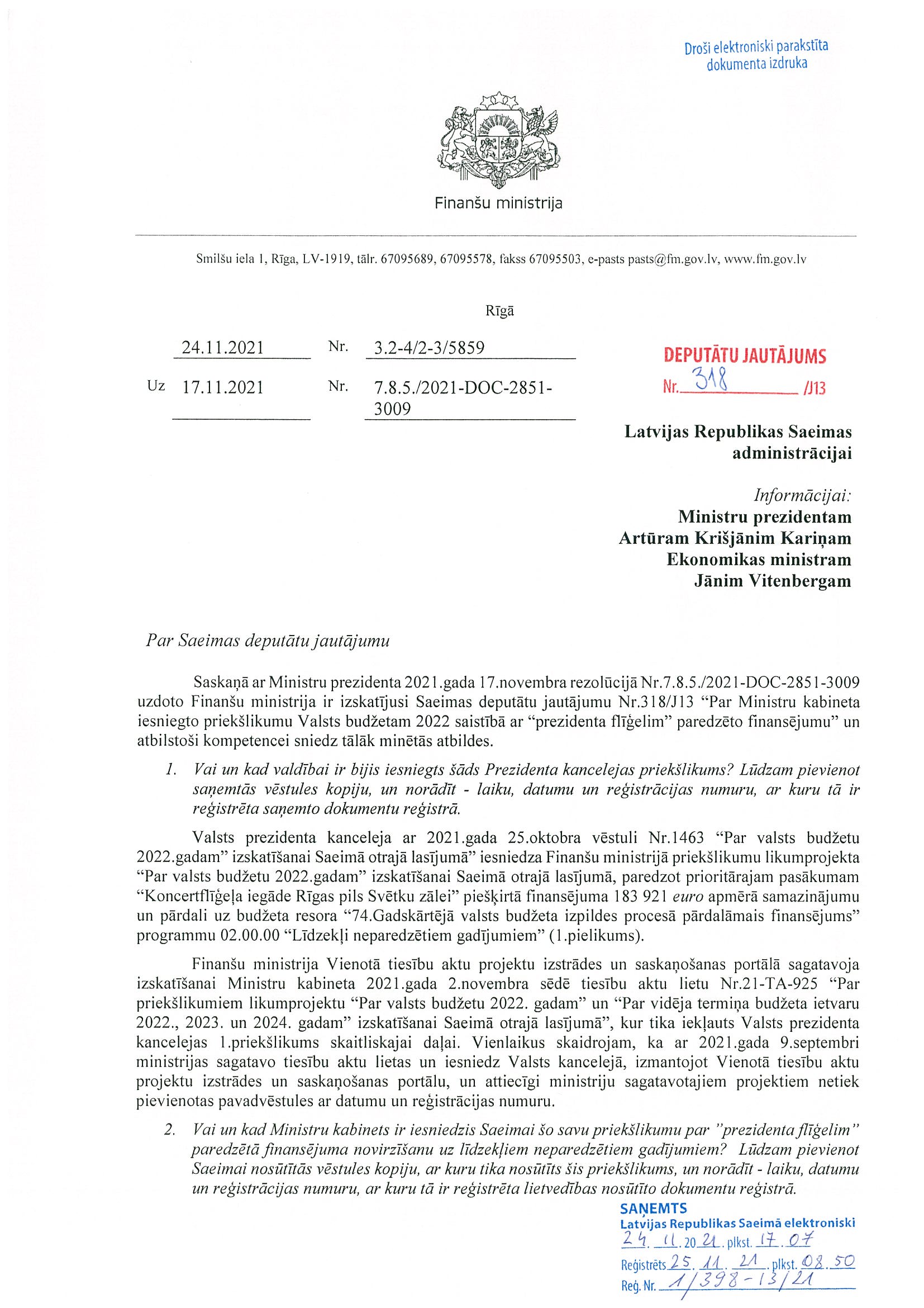 Punkts pirmais. Es kā Budžeta un finanšu (nodokļu) komisijas deputāts varu apliecināt, ka Budžeta un finanšu (nodokļu) komisija nav saņēmusi nekādas vēstules no Valsts prezidenta kancelejas ar ierosinājumu, ka atsakās no šā slavenā flīģeļa iegādes kaut kādu iemeslu dēļ. Šādu vēstuli es neesmu redzējis. Ja Budžeta un finanšu (nodokļu) komisija tiešām ir tādu saņēmusi, bet nav iepazīstinājusi komisijas deputātus ar šādu vēstuli, nu tad, protams, Budžeta un finanšu (nodokļu) komisijas priekšsēdētājam Mārtiņam Bondaram tagad ir visas iespējas pieslēgties šīm debatēm, pieteikties un pateikt, ka, nē, šāda vēstule bija saņemta.