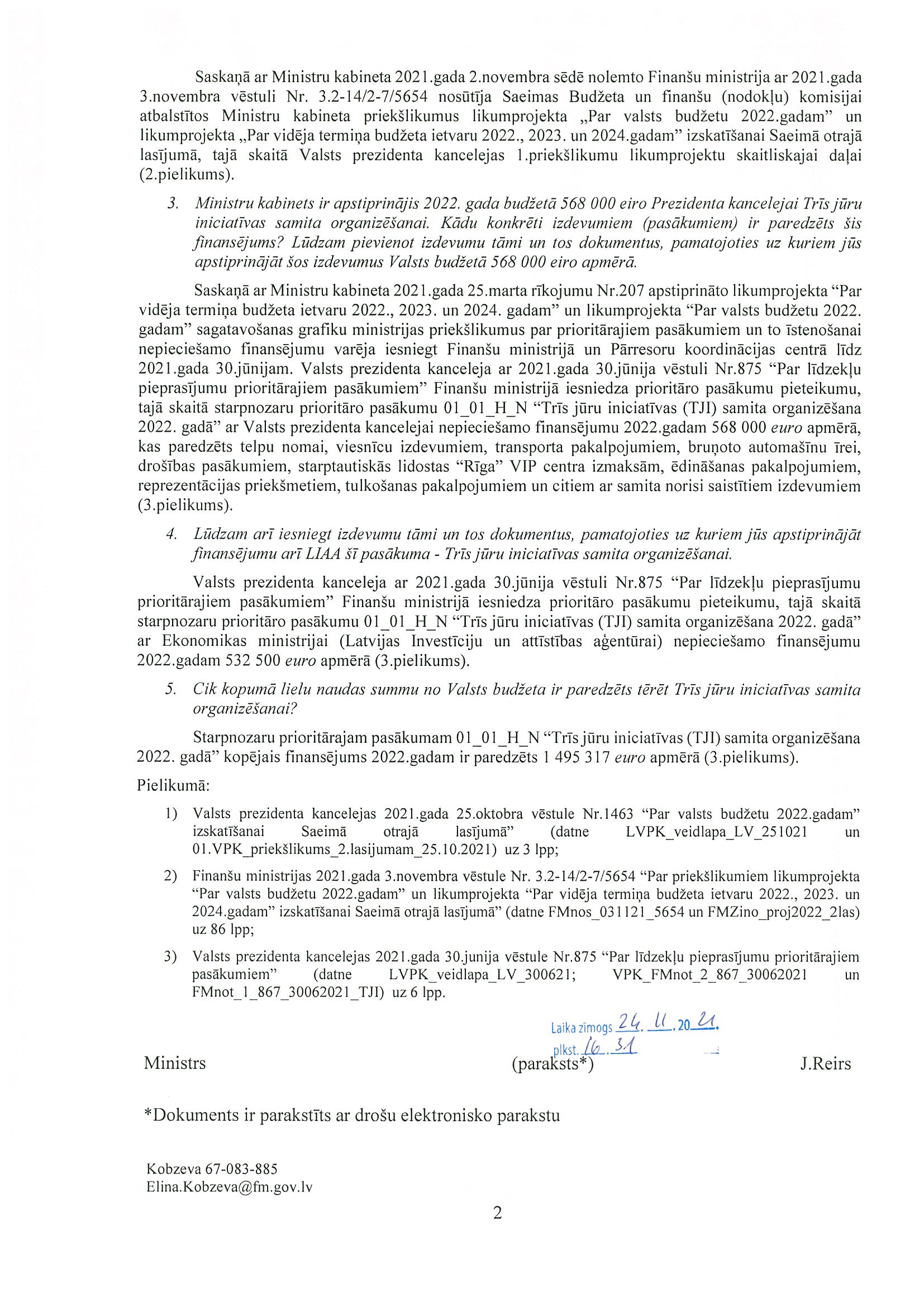 Es pieprasīju Ārlietu ministrijai, ārlietu ministram sniegt komentārus, atbildes saistībā ar šo paredzēto finansējumu. Ko par to ir domāts darīt? Izrādās, ka ar tiem, manuprāt, kādiem 380 tūkstošiem, kas ir paredzēti Ārlietu ministrijas budžetā, pamatā tiek paredzēts veikt visu organizatorisko darbu, kas ir saistīts ar Trīs jūru iniciatīvas samita organizēšanu. Ja Ārlietu ministrija ir bijusi kompetenta un nav maldinājusi Saeimu, savu atbildi sniedzot. Tas savukārt nozīmē, ka šis vairāk nekā pusmiljons, kas ir Valsts prezidenta kancelejas budžetā... Absolūti nav saprotams, kā viņi taisās to tērēt.