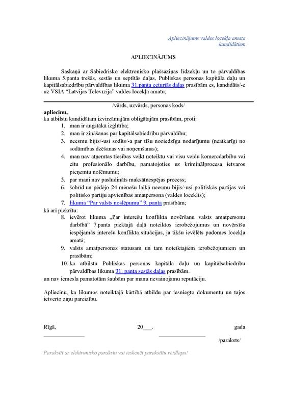 - apliecinājums par atbilstību Sabiedrisko elektronisko plašsaziņas līdzekļu un to pārvaldības likuma 5.panta sestās daļas prasībām