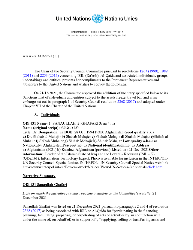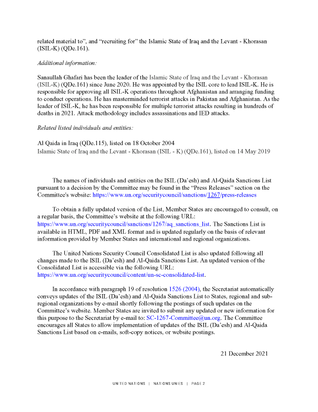 2021. gada 21. decembrī ANO Drošības padomes Komitejas priekšsēdētājs saskaņā ar ANO Drošības padomes Rezolūcijām Nr. 1267 (1999), Nr. 1989 (2011) un Nr. 2253 (2015) informē, ka Komiteja ir noteikusi sankcijas pret vienu fizisku personu. Sankcijas tika noteiktas saskaņā ar ANO Drošības padomes Rezolūciju Nr. 2368 (2017). Lūgums skatīt ANO notu un skaidrojošo informāciju pielikumā.