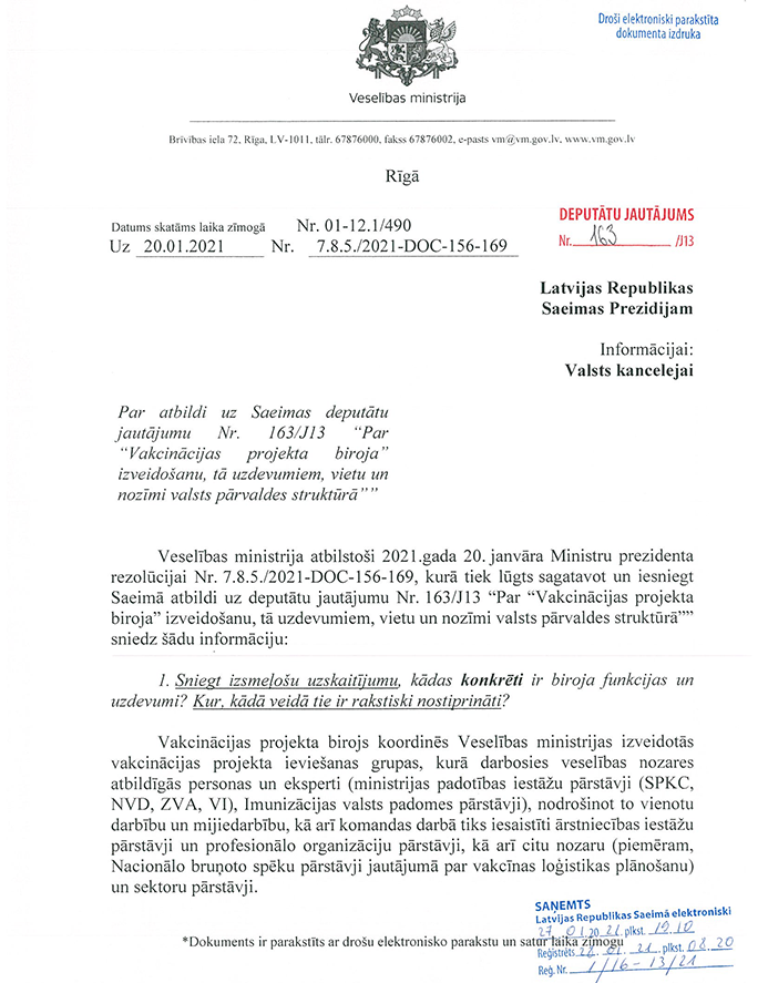Ārkārtas stāvoklis valstī ir jau kopš pagājušā gada 12. marta. Drīz būs gads. Un ko šodien mēs varam lasīt? Ka veselības ministrs paziņo, ka ir vakcinācijas plāns... Atļaušos nocitēt veselības ministra teikto: "Mums ir plāns!!! Vakcinācijas plāns, kuru šodien apstiprinājām valdībā, ir detalizēts, digitāls un elastīgs. Nenoteiktība ir šī laika vienīgā noteiktība, tagad mēs būsim gatavi rīkoties dažādās situācijās. Gan tad, ja vakcīnu piegādes kavēsies, gan tad, kad to būs ļoti daudz."